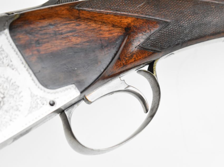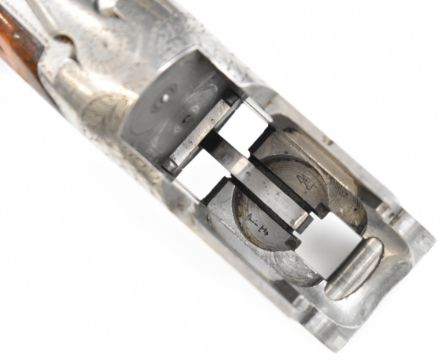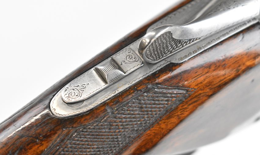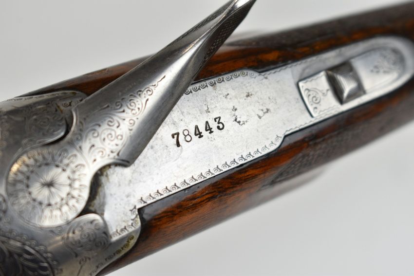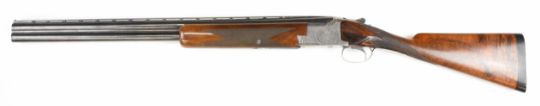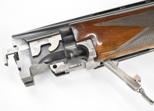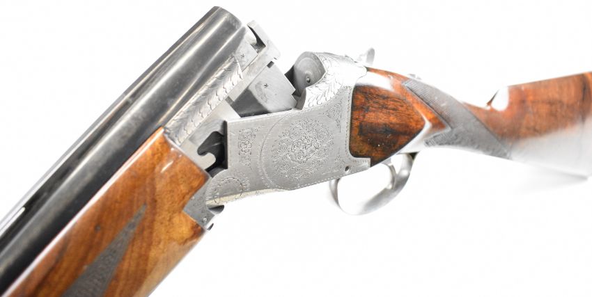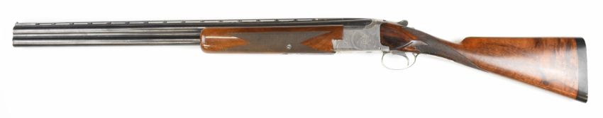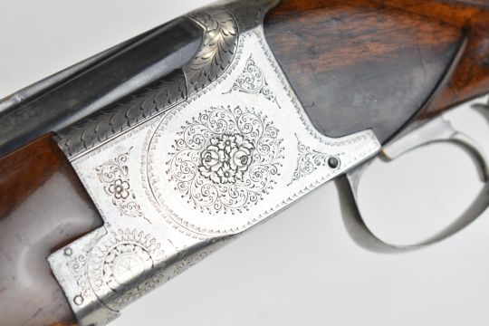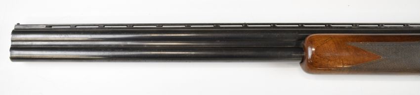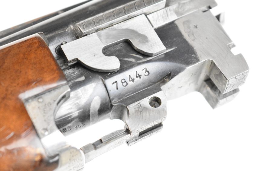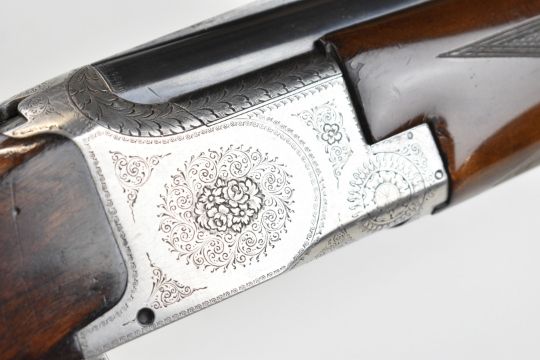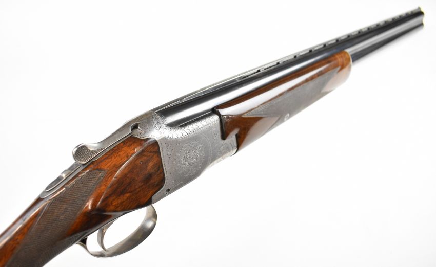 Browning B25 B1 12 bore over and under ejector shotgun with engraved action, underside, trigger guard, top plate and thumb lever, chequered grip and forend, single trigger and 26.5 inch barrels choked cylinder and improved cylinder, overall length 110cm, length of pull 36cm, serial number 78443. PLEASE NOTE THAT A VALID RELEVANT SHOTGUN CERTIFICATE IS REQUIRED TO VIEW OR PURCHASE THIS LOT AND FOR ALL SHOTGUNS OR RIFLES PLEASE ENSURE YOU HAVE THE RELEVANT CERTIFICATE BEFORE BIDDING.