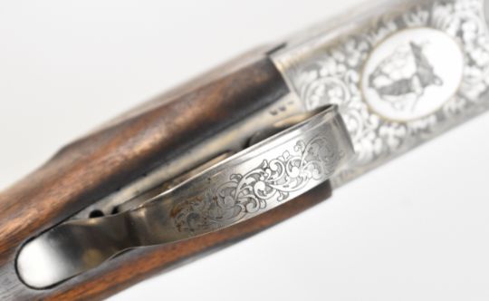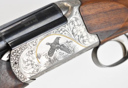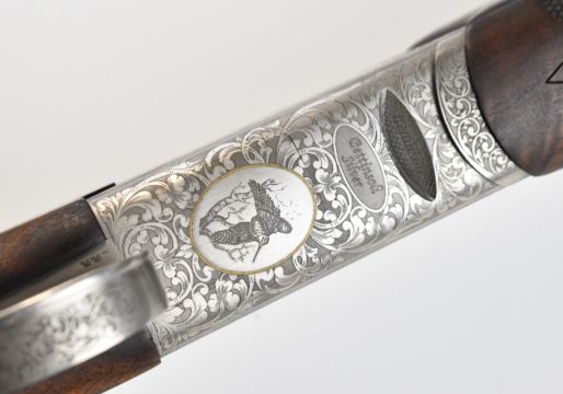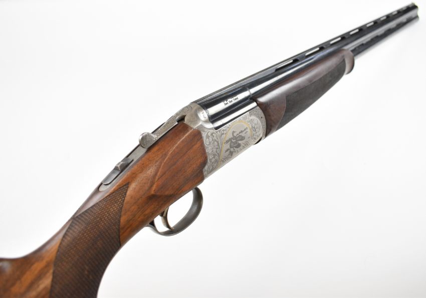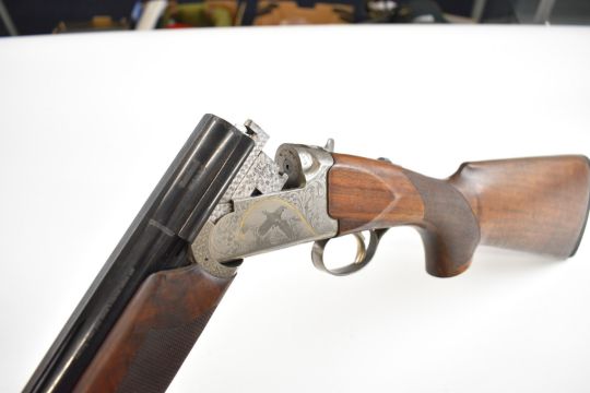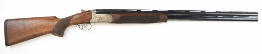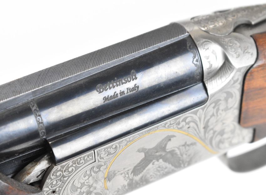 Bettinsoli Silver 12 bore over and under ejector shotgun with engraved scenes of birds and gold inlay to the locks and underside, engraved trigger guard, top plate and thumb lever, chequered semi-pistol grip and forend, single trigger, vented top and central ribs and 30 inch multi-choke barrels, overall length 119.5cm, length of pull 37cm, serial number 224827. PLEASE NOTE THAT A VALID RELEVANT SHOTGUN CERTIFICATE IS REQUIRED TO VIEW OR PURCHASE THIS LOT AND FOR ALL SHOTGUNS OR RIFLES. PLEASE ENSURE YOU HAVE THE RELEVANT CERTIFICATE BEFORE BIDDING.