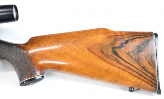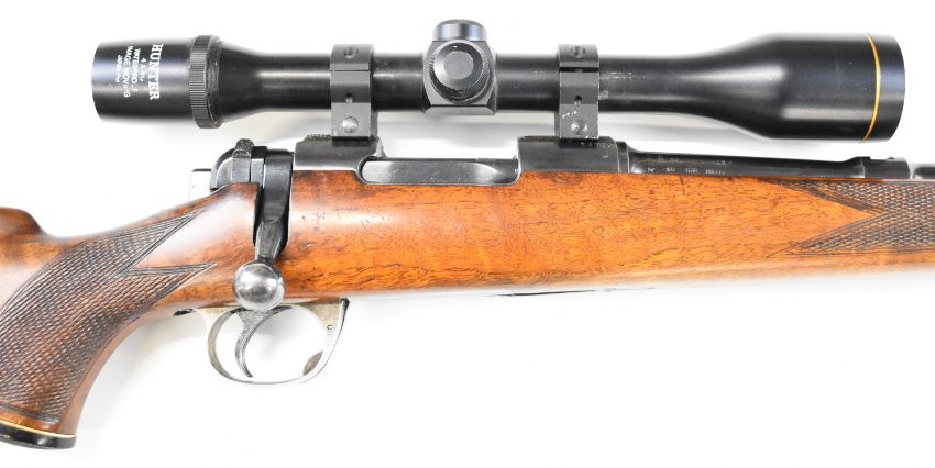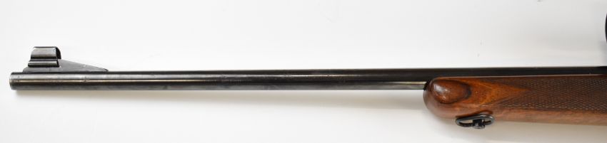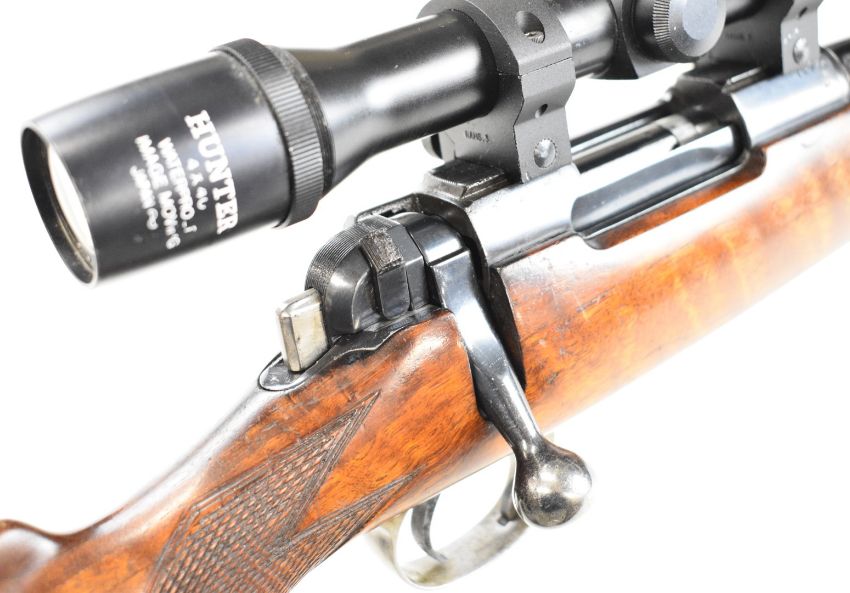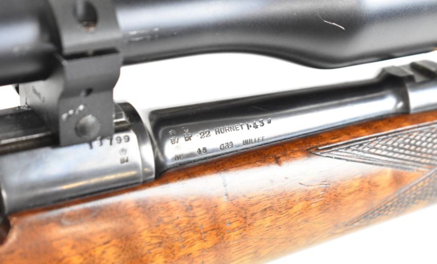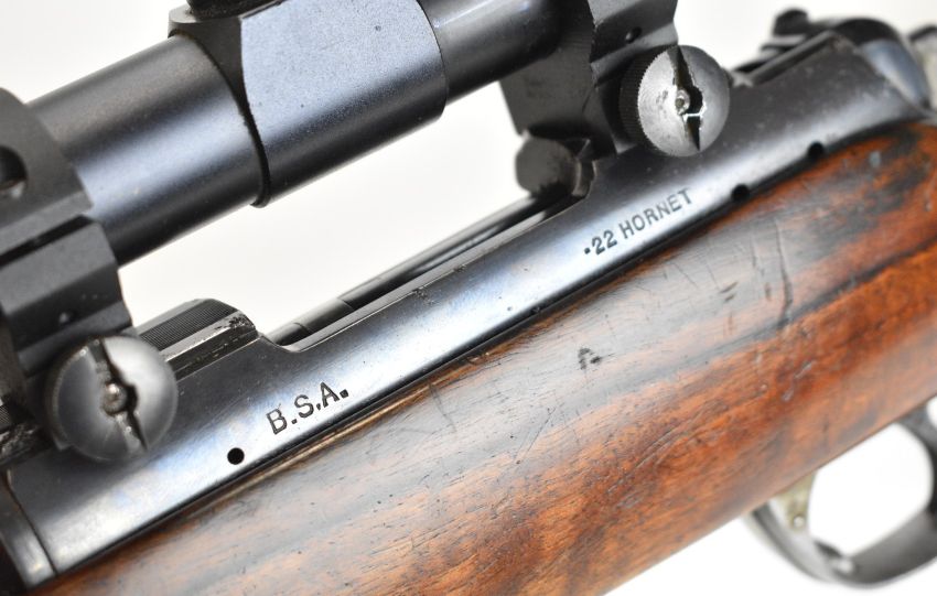 BSA .22 Hornet bolt-action rifle with chequered semi-pistol grip and forend, sling mounts, Hunter 4x40 scope and 24.5 inch barrel, overall length 108cm, serial number 13799. PLEASE NOTE THAT A VALID RELEVANT FIREARMS CERTIFICATE IS REQUIRED TO VIEW OR PURCHASE THIS LOT AND FOR ALL SHOTGUNS OR RIFLES. PLEASE ENSURE YOU HAVE THE RELEVANT CERTIFICATE BEFORE BIDDING.