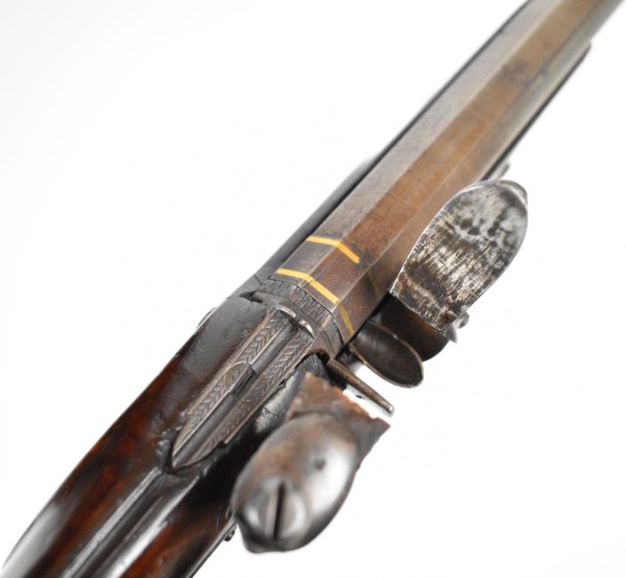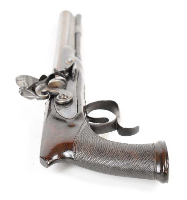H W Mortimer & Son flintlock saw handled target pistol with named and engraved lock, engraved scrolling trigger guard, hammer, butt cap and top plate, chequered grip, horn tipped wooden ram-rod and 10 inch gold band inlaid smooth bored octagonal Damascus barrel, overall length 41cm.