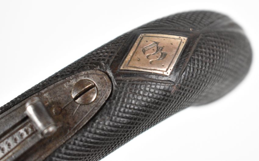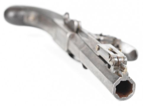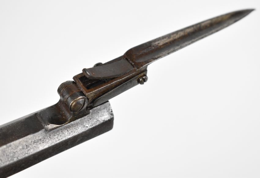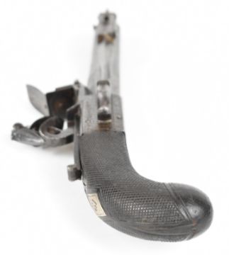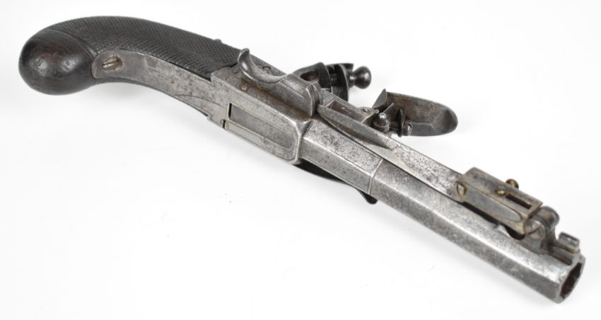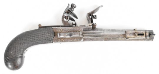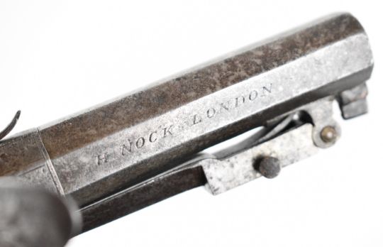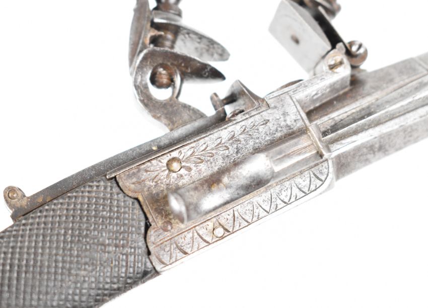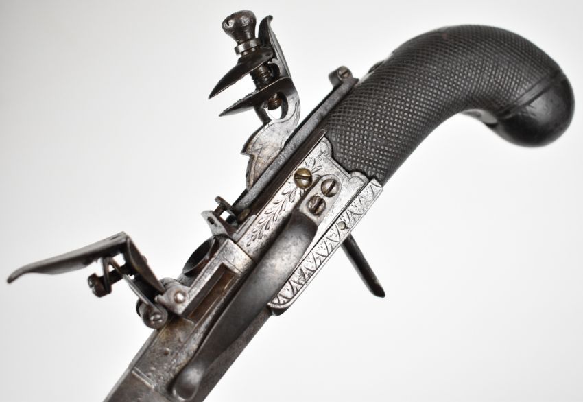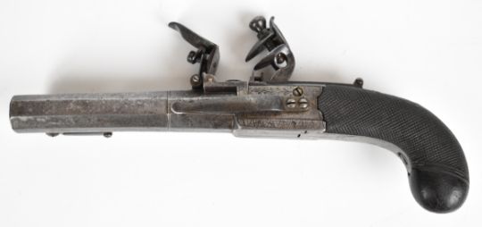 Henry Nock of London flintlock belt pistol with sprung bayonet, folding trigger, engraved lock, hammer, underside and thumb slide safety, chequered grips, engraved wrist cartouche and named 4 inch rifled octagonal barrel, overall length 22cm.