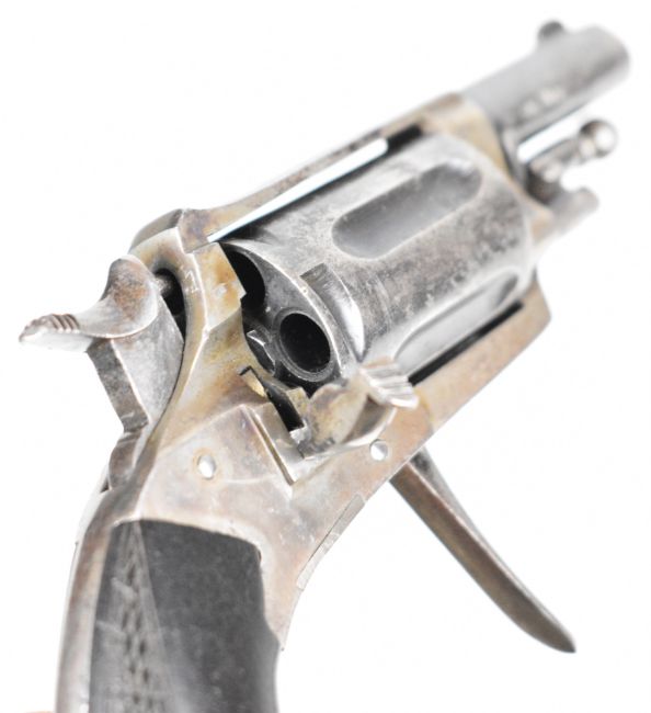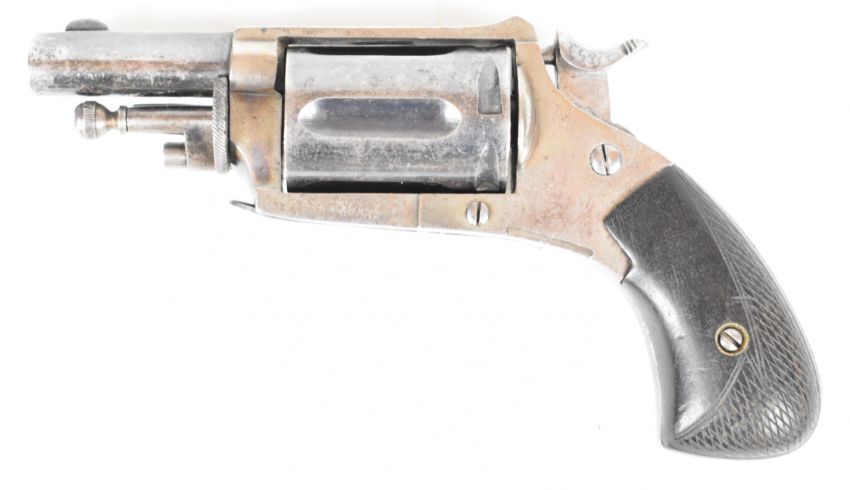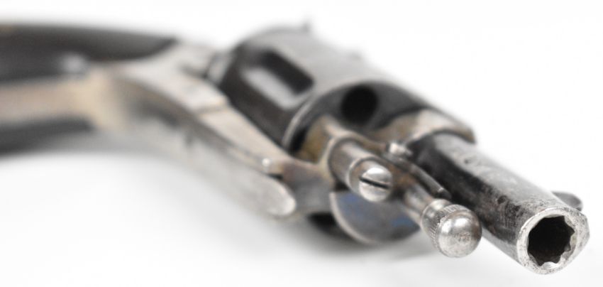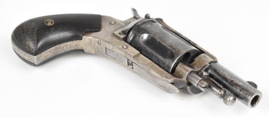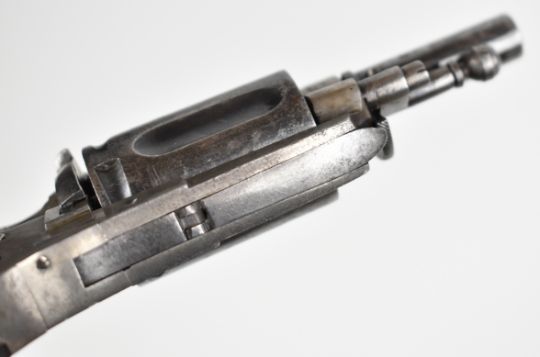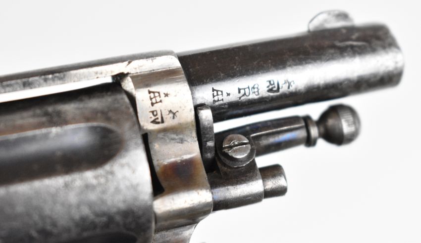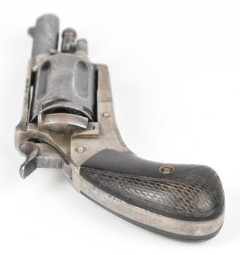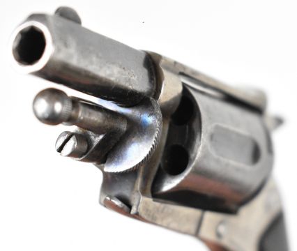 Belgian 5.5mm Velo-Dog six-shot pocket revolver with shaped and chequered wooden grips, folding trigger, fluted cylinder and 1.5 inch rifled barrel, overall length 14cm.