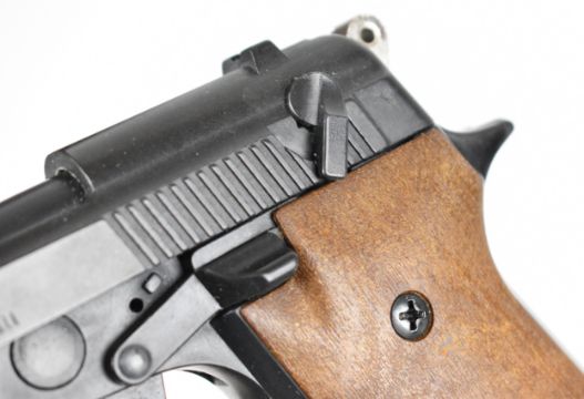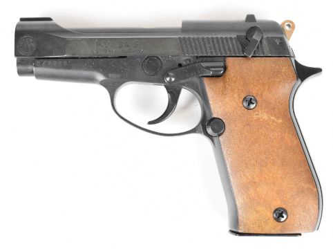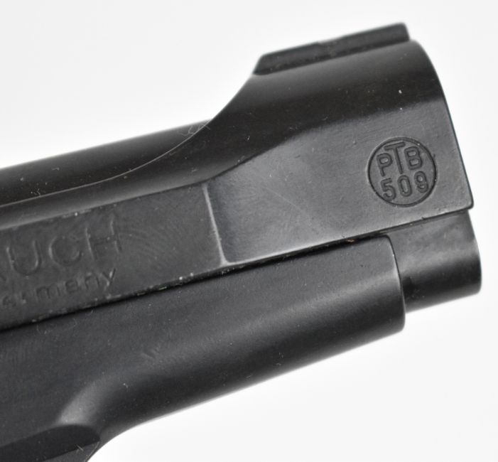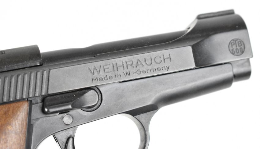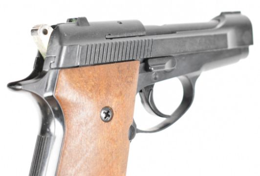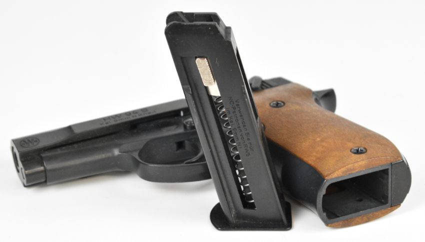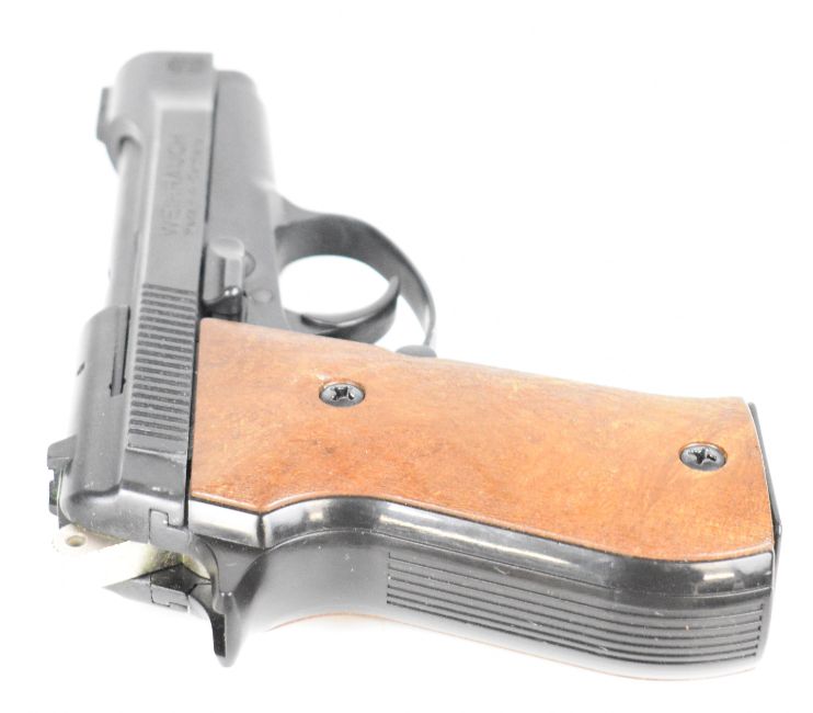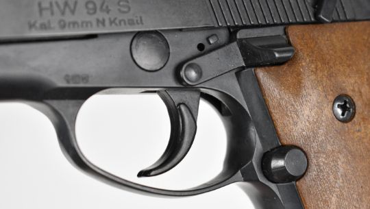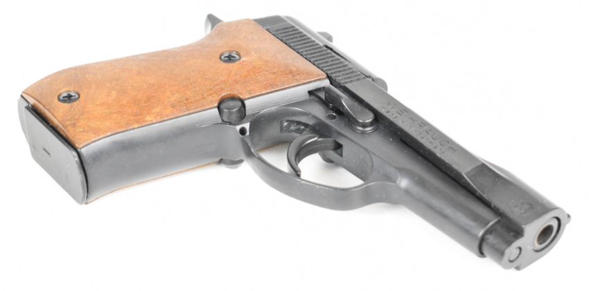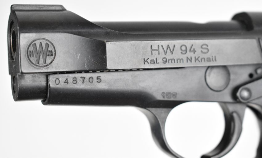 Weihrauch HW 94 S 9mm blank firing semi-automatic pistol with shaped wooden grips and multi-shot magazine, serial number 048705.
