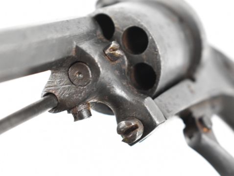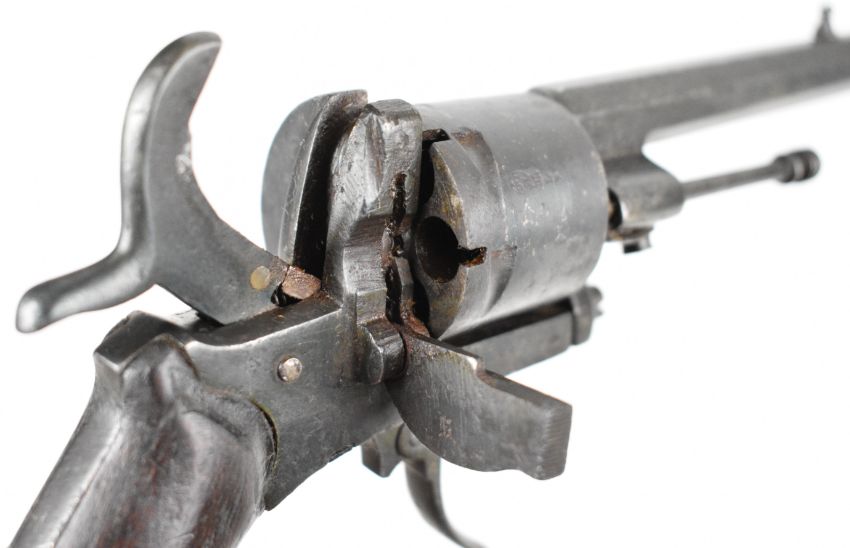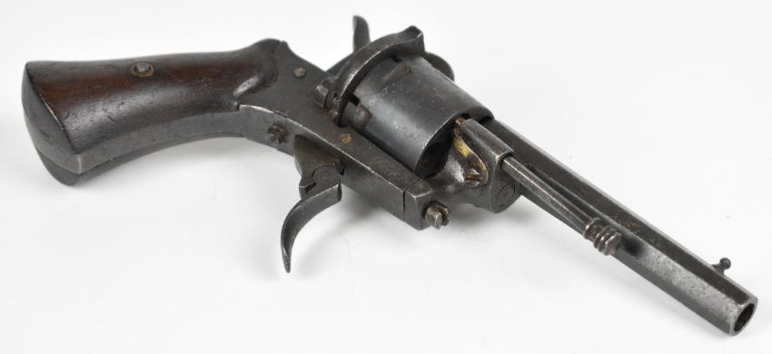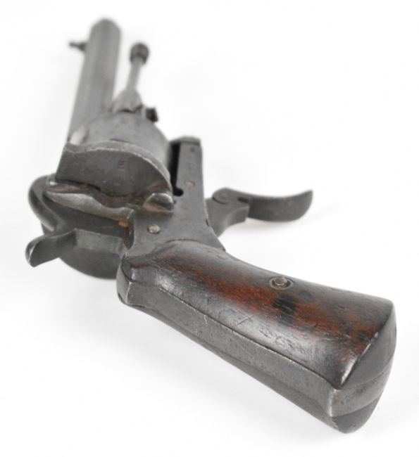 Belgian six-shot double-action pinfire revolver with shaped wooden grips, folding trigger and 3.5 inch octagonal rifled barrel, overall length 20cm, serial number 1956.
