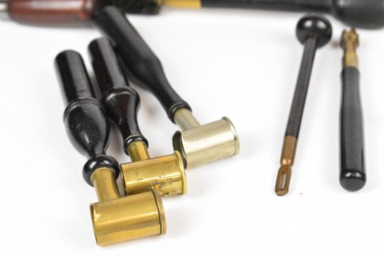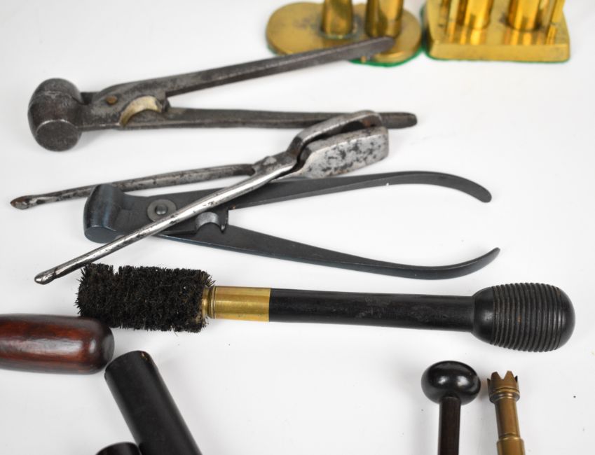 Twenty-one gun and gunsmith tools including bullet moulds, chamber brush, James Dixon & Sons and similar powder measures, nipple keys, turnscrews, cartridge extractor, bore inspector, re-loading tools etc.