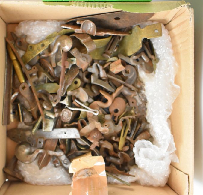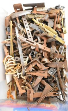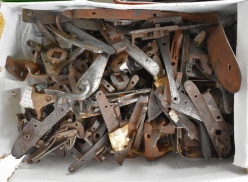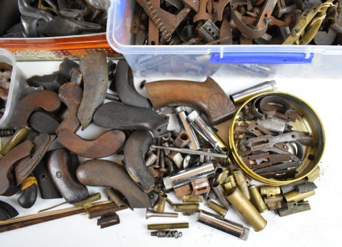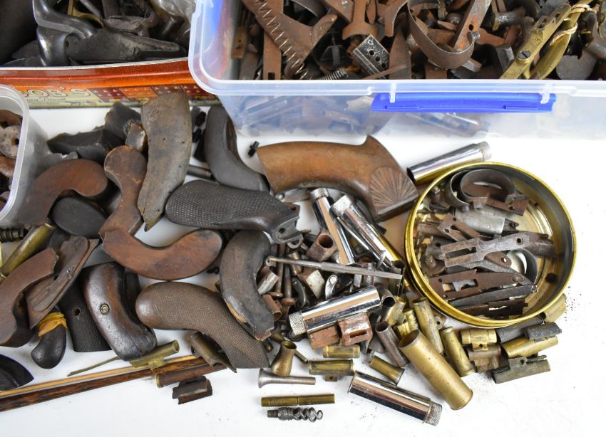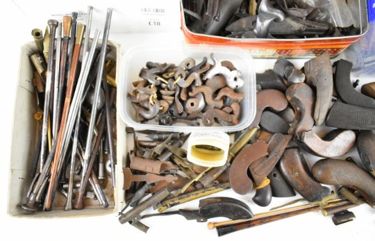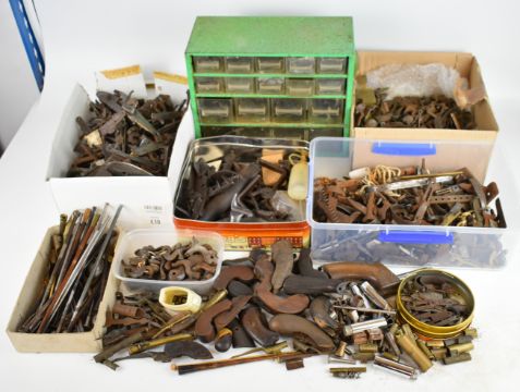 A very large collection of mainly antique gun parts including flintlock, percussion and pinfire locks, hammers, trigger guards, ram-rods, grips, pistol barrels etc, many named including Sharp, Barnett, Escott & Cornish of Okehampton, Joseph Manton, Samuel Higham, Charles Osbourne, S Rooke, Witton, William Young of Bury, G Hunter, Forrest & Sons of Jedburgh etc