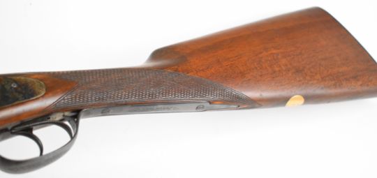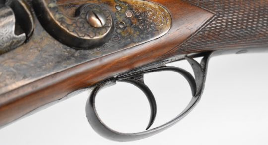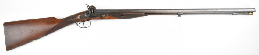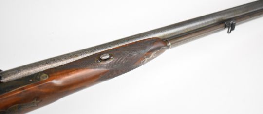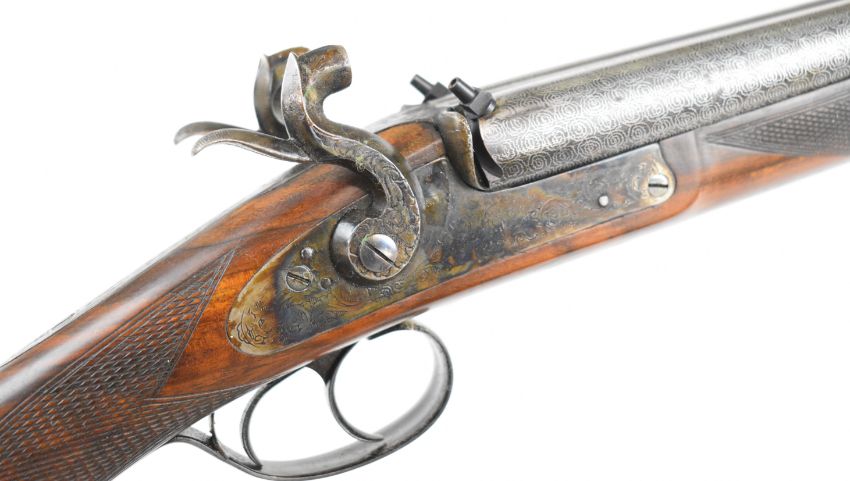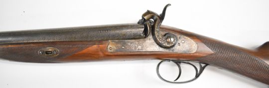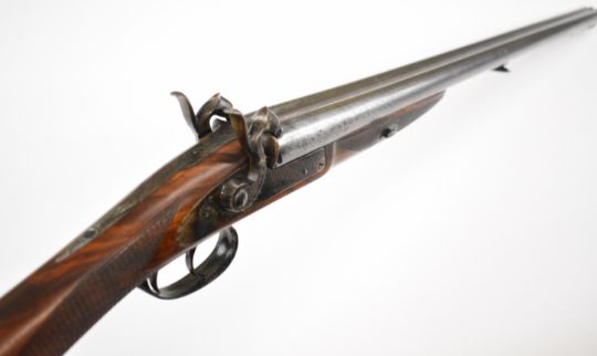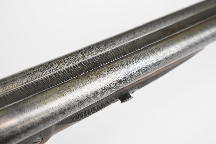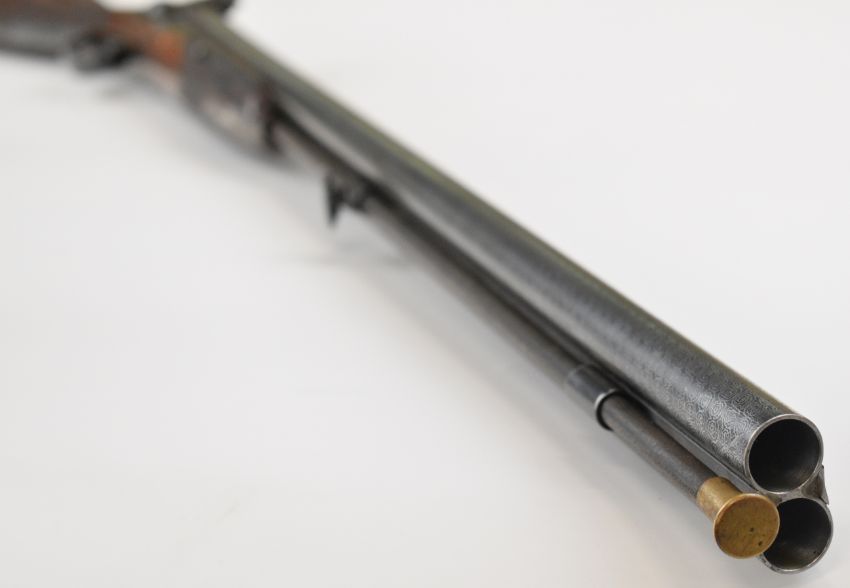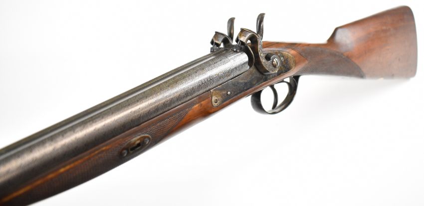 Pedersoli 12 bore side by side muzzle loading percussion hammer action shotgun with engraved locks, hammers, trigger guard and top strap, chequered grip, vacant cartouche to the underside of the stock, brass tipped wooden ramrod, double trigger and 29 inch engraved faux Damascus barrels, overall length 115cm, serial number 15137. PLEASE NOTE THAT A VALID RELEVANT SHOTGUN CERTIFICATE IS REQUIRED TO VIEW OR PURCHASE THIS LOT AND FOR ALL SHOTGUNS OR RIFLES PLEASE ENSURE YOU HAVE THE RELEVANT CERTIFICATE BEFORE BIDDING.