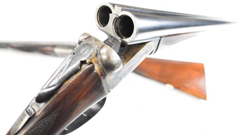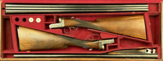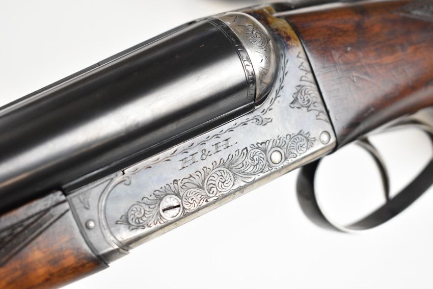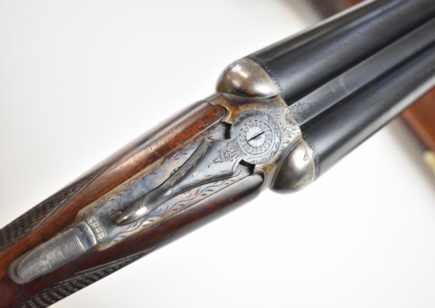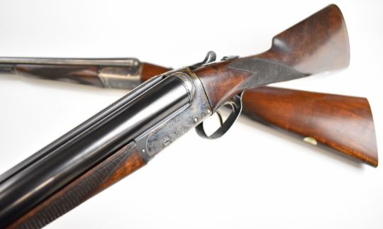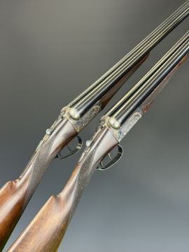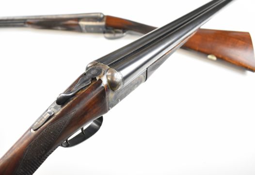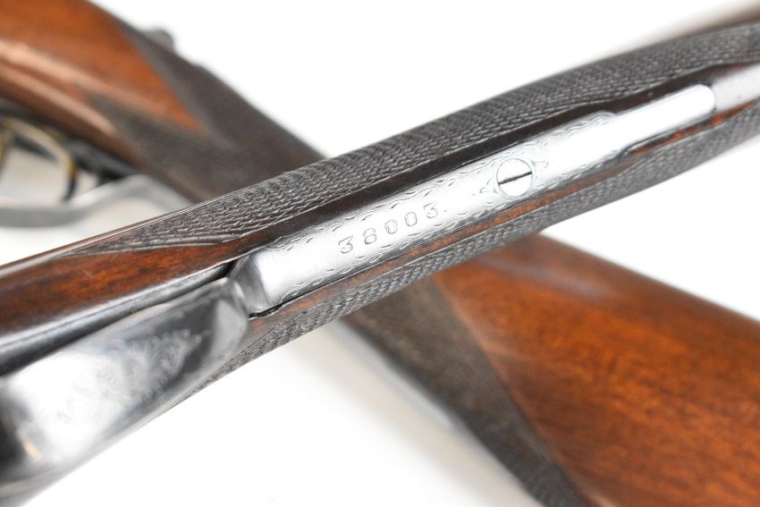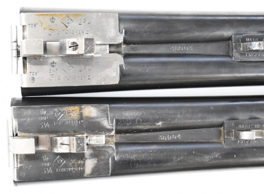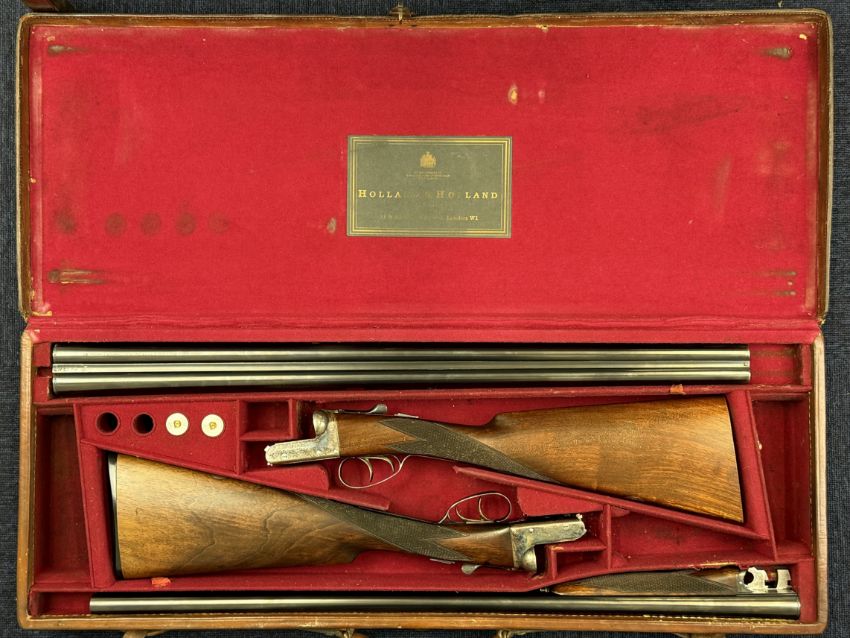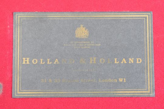 Pair of Holland & Holland 12 bore side by side ejector shotguns each with named and engraved locks, engraved trigger guard, underside, top plate, thumb lever and fences, chequered grip and forend, cartouche to the underside of the stock, double trigger and named 28 inch barrels engraved 'Shot & Regulated by Holland & Holland Ltd 13 Bruton Street London W.1.', serial numbers 38003 and 38004, in leather and brass bound double case with fitted interior and 'By Appointment to H.R.H. The Duke of Edinburgh Rifle Makers Holland & Holland Established 1835 31 & 39 Bruton Street London W1' label. PLEASE NOTE THAT A VALID RELEVANT SHOTGUN CERTIFICATE IS REQUIRED TO VIEW OR PURCHASE THIS LOT AND FOR ALL SHOTGUNS OR RIFLES. PLEASE ENSURE YOU HAVE THE RELEVANT CERTIFICATE BEFORE BIDDING.