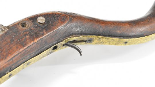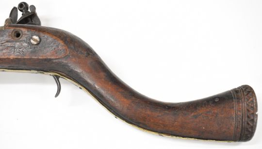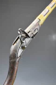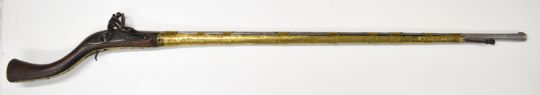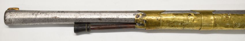 Turkish, Ottoman or Middle Eastern flintlock jezail with East India Company lock engraved with a lion, carved stock, brass barrel bands and 45.5 inch barrel, overall length 146cm.
