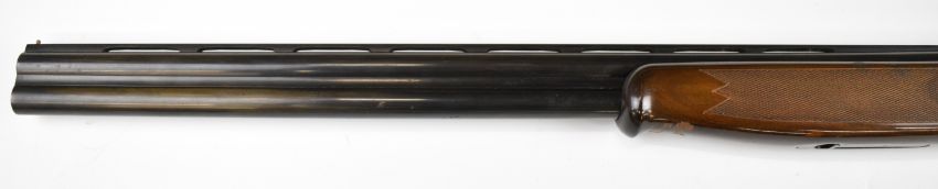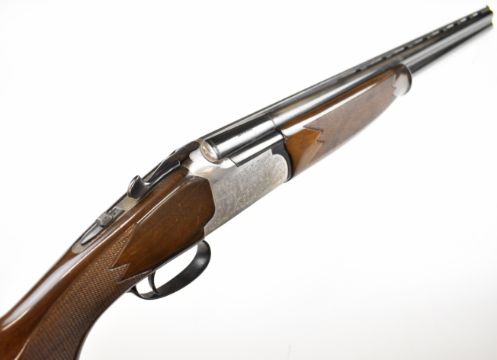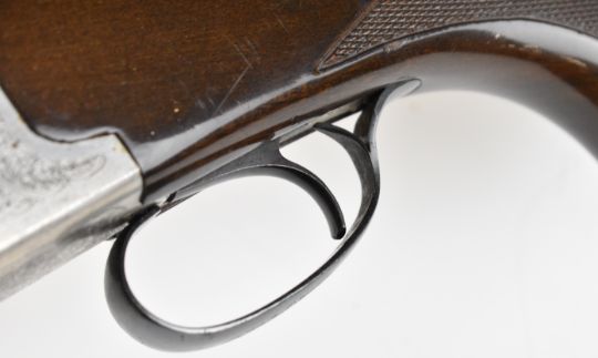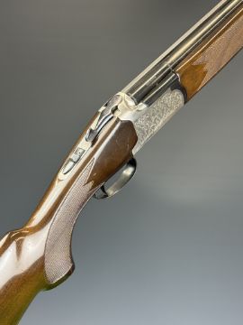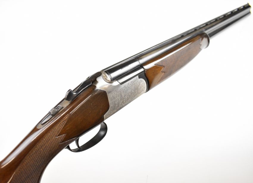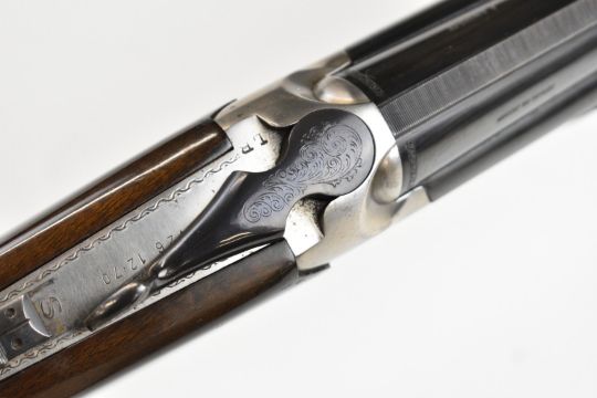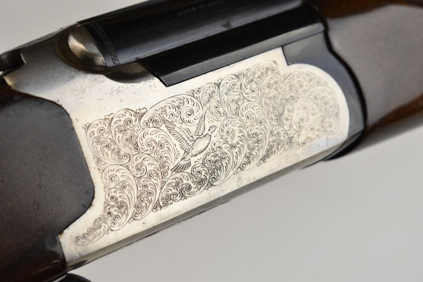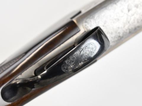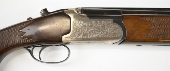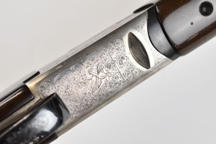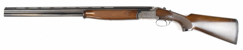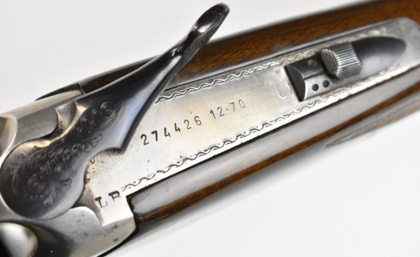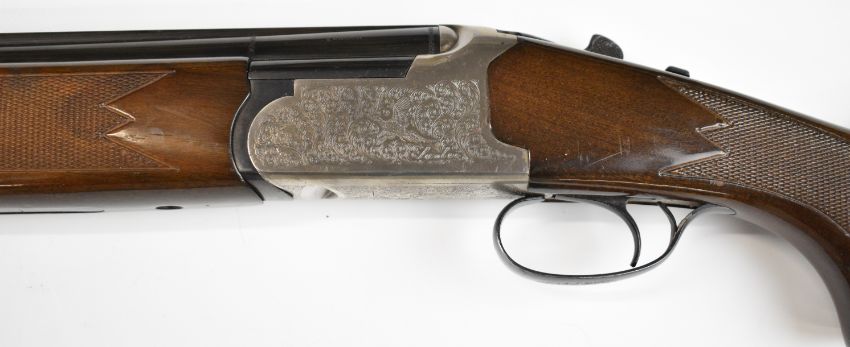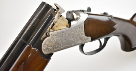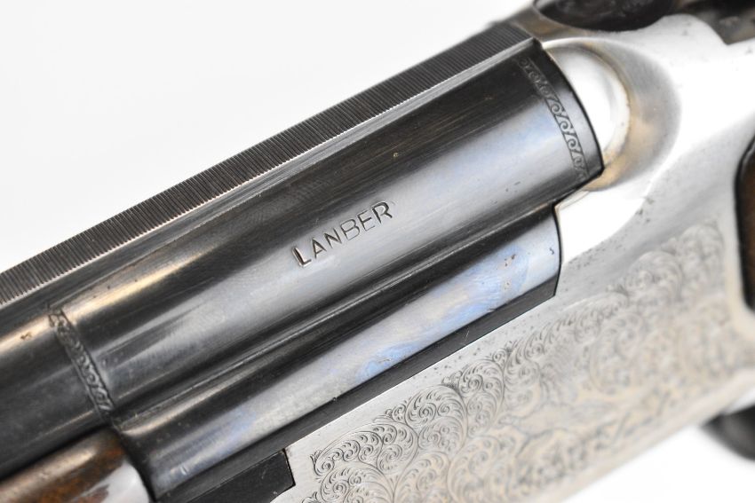 Lanber 12 bore over and under ejector shotgun with engraved scenes of birds to the action and underside, engraved trigger guard, top plate and thumb lever, chequered semi-pistol grip and forend, single trigger, vented top rib and 27.5 inch barrels choked ½ and improved cylinder, overall length 113cm, length of pull 36cm, serial number 274426. PLEASE NOTE THAT A VALID RELEVANT SHOTGUN CERTIFICATE IS REQUIRED TO VIEW OR PURCHASE THIS LOT AND FOR ALL SHOTGUNS OR RIFLES. PLEASE ENSURE YOU HAVE THE RELEVANT CERTIFICATE BEFORE BIDDING.