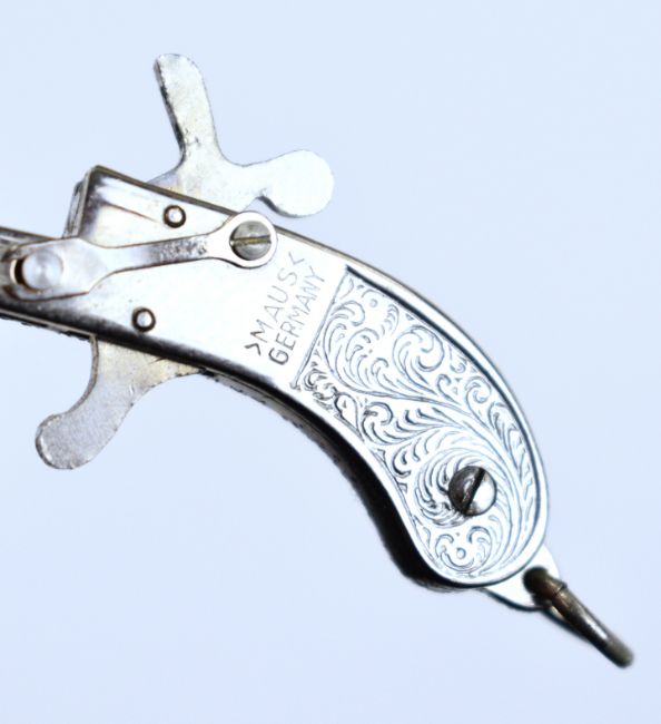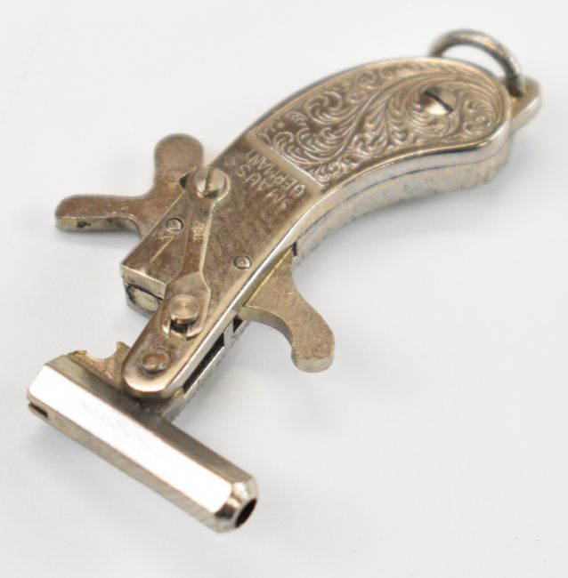 German miniature pinfire hammer action pistol with engraved metal grips and 15mm octagonal barrel, overall length 4.2cm, with percussion caps.