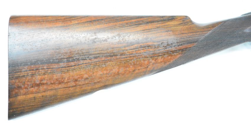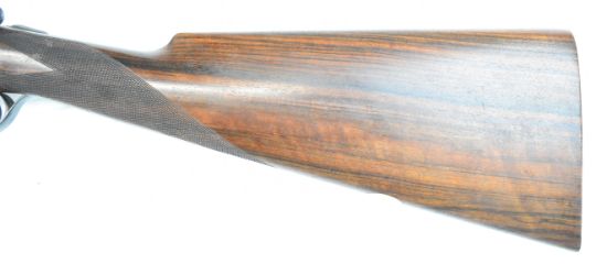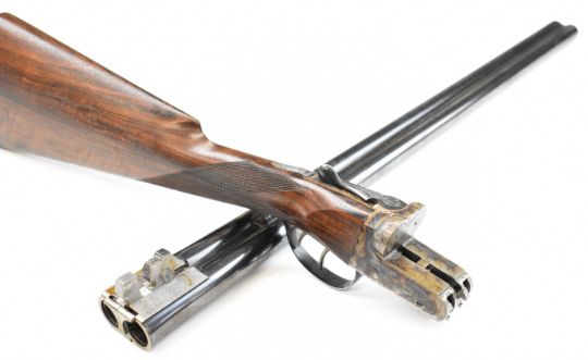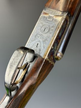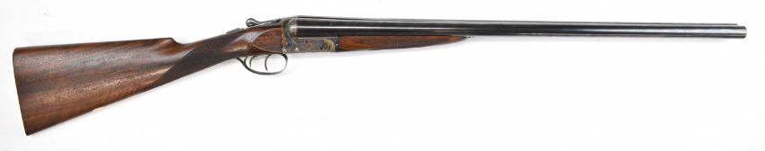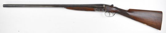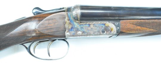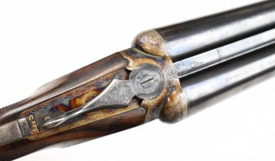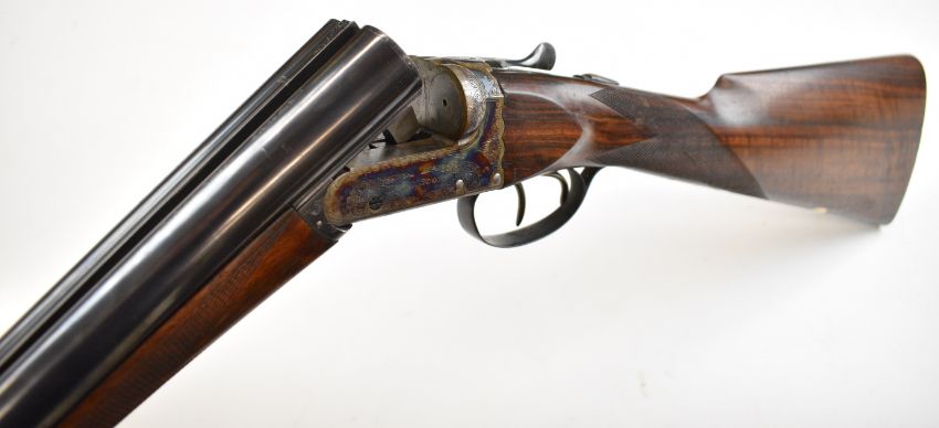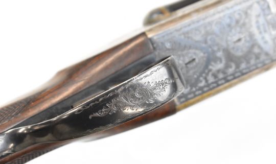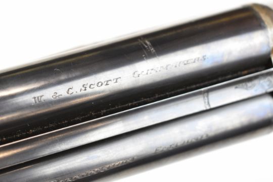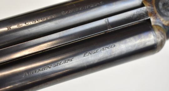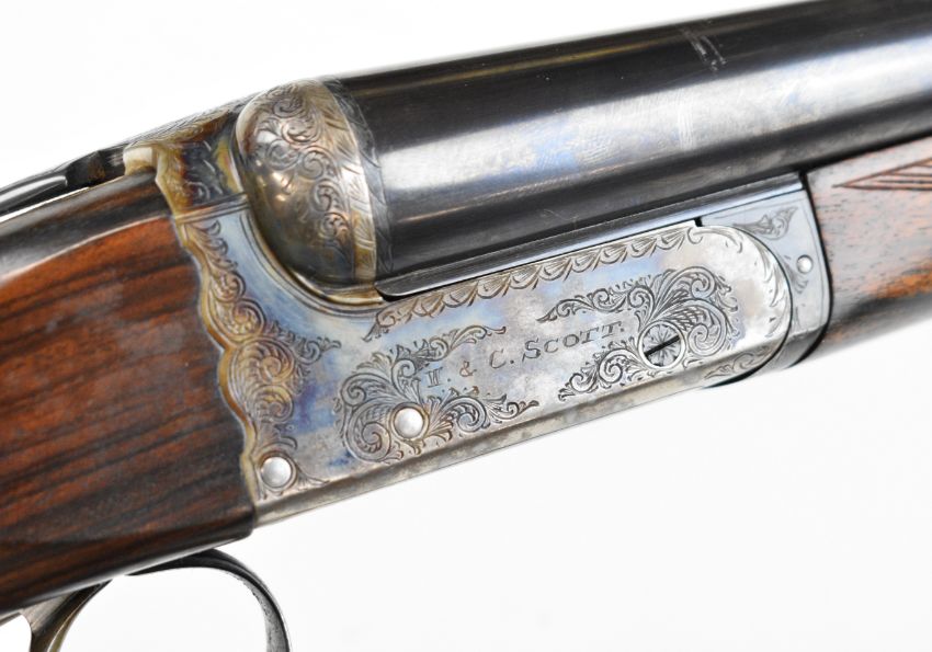 W&C Scott The Bowood 12 bore side by side shotgun with named and engraved locks and underside, engraved trigger guard, top plate, thumb lever and fences, chequered grip and forend, vacant hallmarked 9ct gold cartouche to the underside of the stock, double trigger and named 26 inch barrels choked improved cylinder and ¾, overall length 108.5cm, length of pull 37.5cm, serial number 146733. PLEASE NOTE THAT A VALID RELEVANT SHOTGUN CERTIFICATE IS REQUIRED TO VIEW OR PURCHASE THIS LOT AND FOR ALL SHOTGUNS OR RIFLES PLEASE ENSURE YOU HAVE THE RELEVANT CERTIFICATE BEFORE BIDDING.