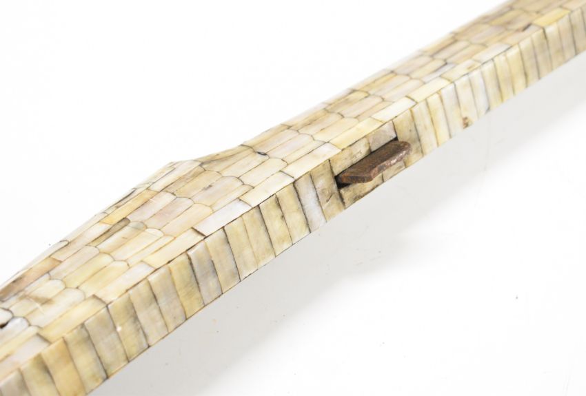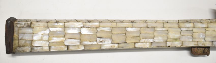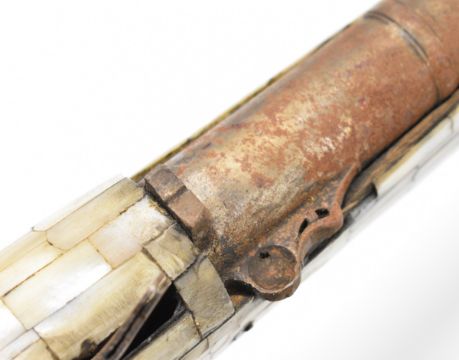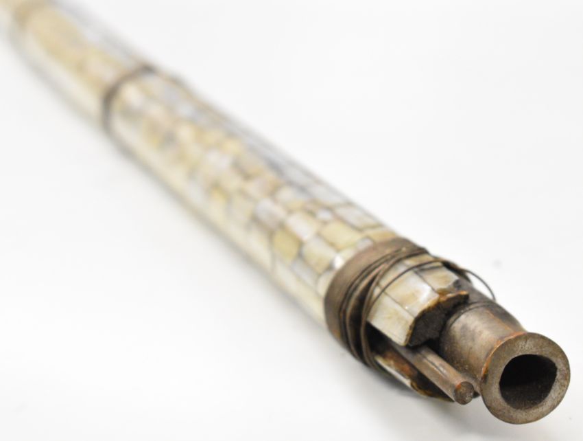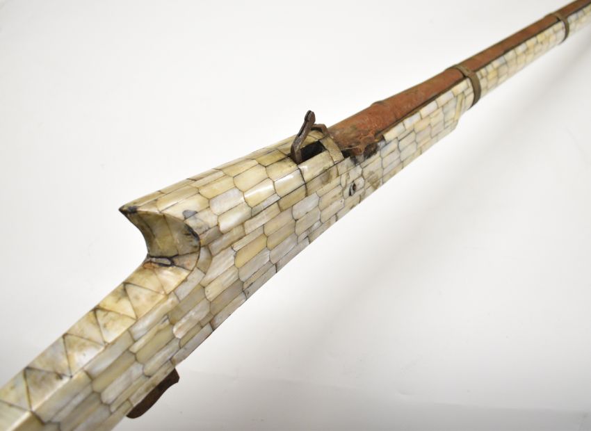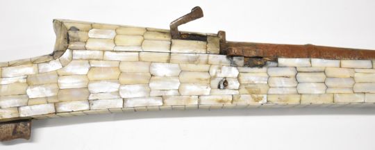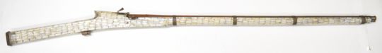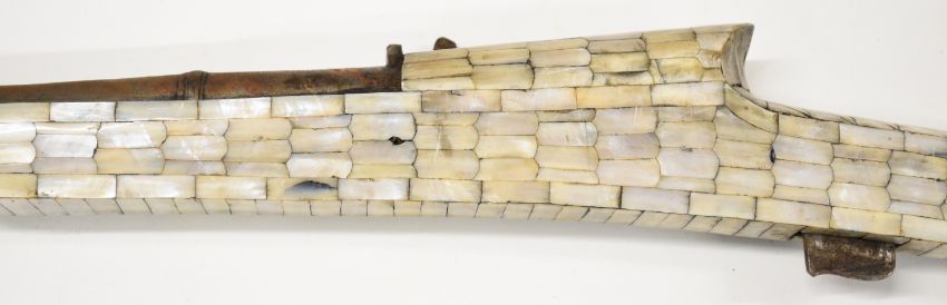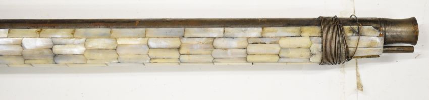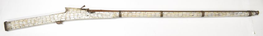 Indian matchlock gun decorated with mother of pearl panels and with brass wire barrel bands and 43.5 inch barrel, overall length 163cm.