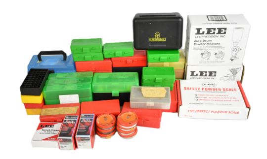 A collection of shotgun and rifle cartridge re-loading equipment including auto drum powder measure, safety powder measure, Lee quick charge turret press, Lee safety primer feed, ammunition cases, Eley Surefire primers, Pedersoli black powder measure set etc together with 200 Hornady Black Powder .457 round lead balls.