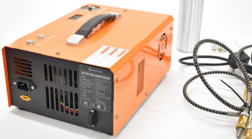 ToAuto A2 Model CZGYBAUTO portable compressor suitable for re-filling PCP air rifles or dive bottles, with various spare parts and accessories.