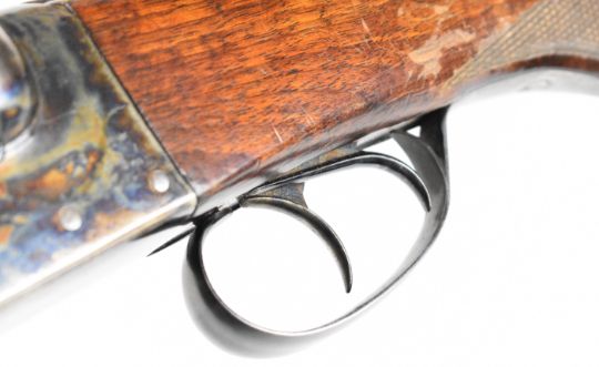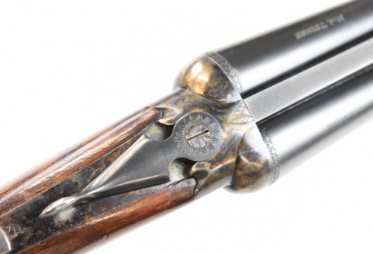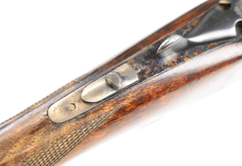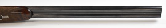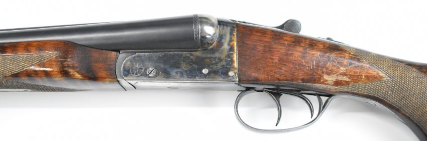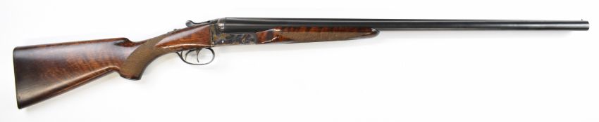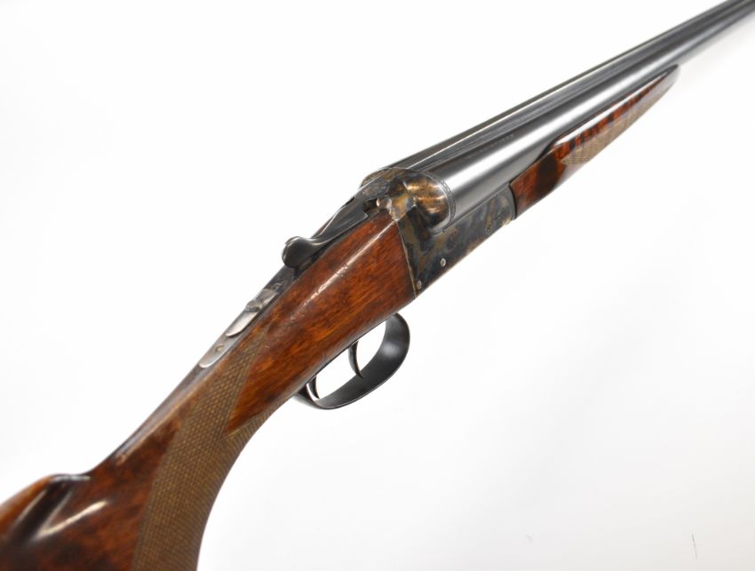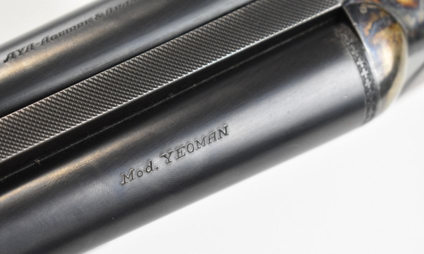 AYA Yeoman 12 bore side by side shotgun with chequered semi-pistol grip and beaver tail forend, double trigger and named 28 inch barrels choked full and ½, overall length 114.5cm, length of pull 37cm, serial number 561579. PLEASE NOTE THAT A VALID RELEVANT SHOTGUN CERTIFICATE IS REQUIRED TO VIEW OR PURCHASE THIS LOT AND FOR ALL SHOTGUNS OR RIFLES. PLEASE ENSURE YOU HAVE THE RELEVANT CERTIFICATE BEFORE BIDDING.