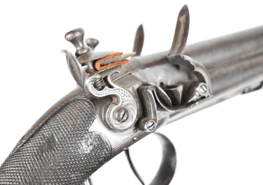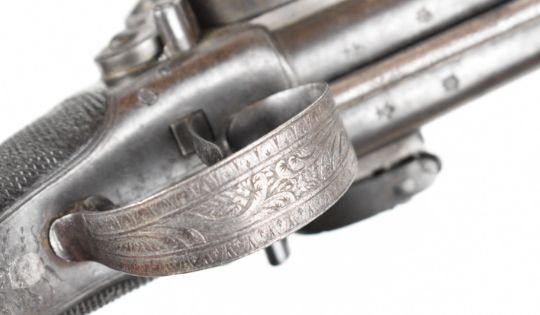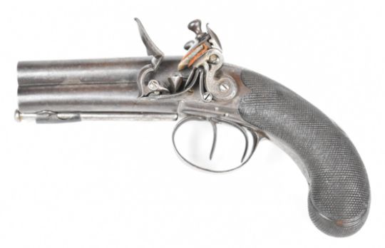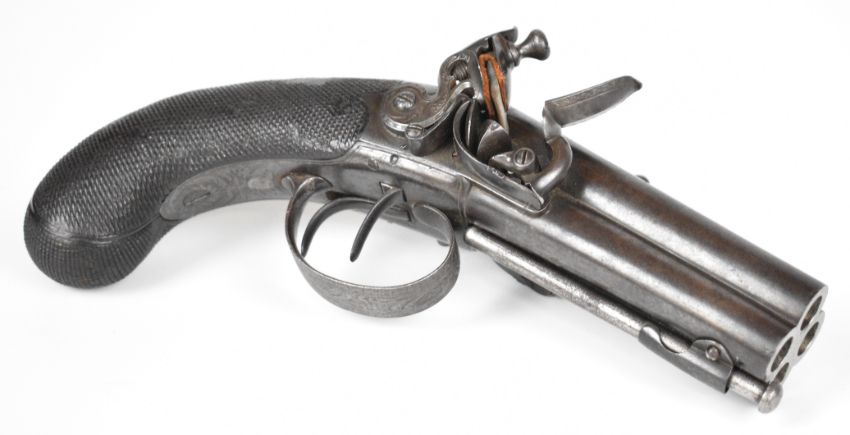 William Smith of London 80 bore flintlock quadruple barrelled volley pistol with engraved hammers, trigger guard and underside, chequered grip, vacant wrist cartouche, double trigger and 4 inch barrels, overall length 21.5cm.