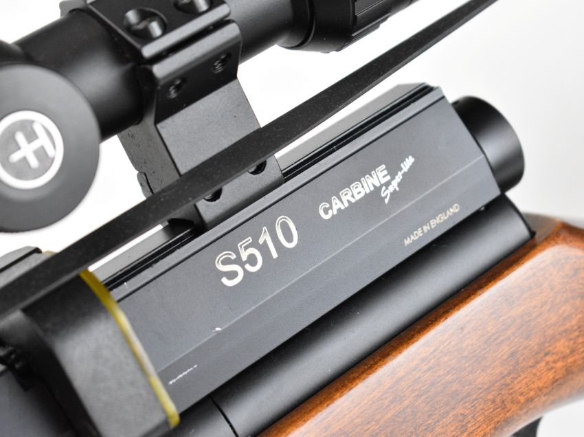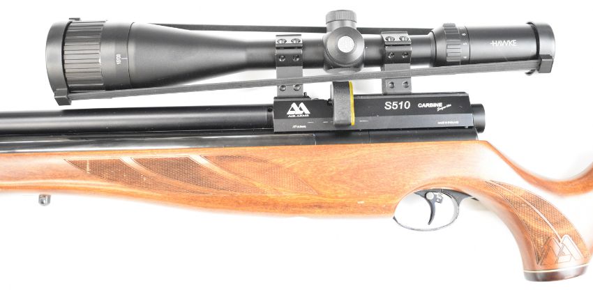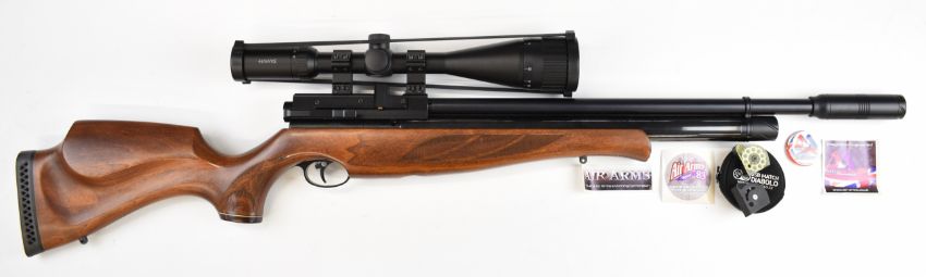 Air Arms S510 Carbine Super-Lite .177 PCP air rifle with chequered semi-pistol grip and forend, raised cheek piece, three 10-shot magazines, adjustable trigger, sling mounts, Hawke Vantage 4-16x50 scope and Q-Tec sound moderator, serial number 098441, with User Handbook and accessories. PLEASE NOTE: ALL POST - 1939 AIR GUNS CAN ONLY BE SHIPPED TO AN RFD AND NOT TO A HOME ADDRESS.