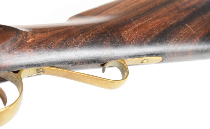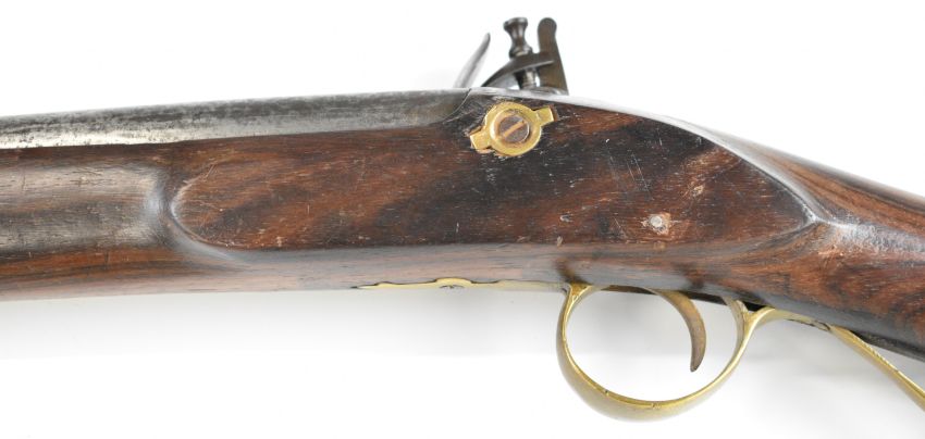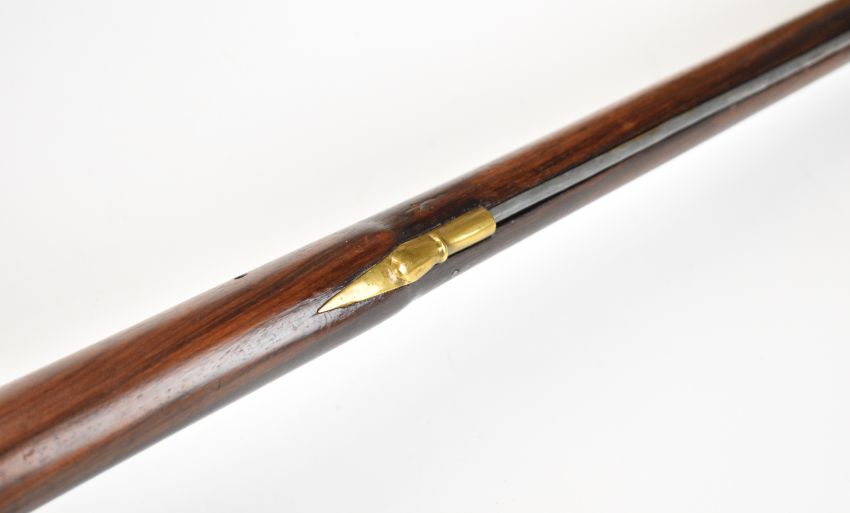 Enfield pattern flintlock musket with brass scrolling trigger guard, butt plate and mounts, steel ram-rod, stock stamped '277' and 40.5 inch smooth bored barrel, overall length 120.5cm.