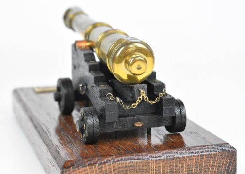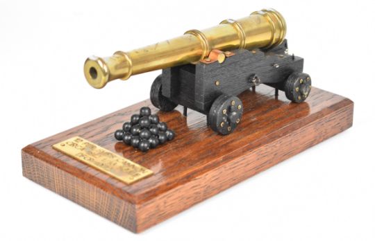 1:16 scale model of a 12pdr ship's cannon with 7.5 inch brass barrel, mounted on wooden base with plaque.