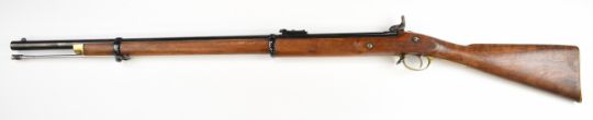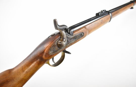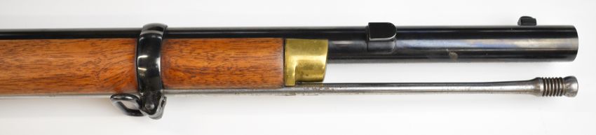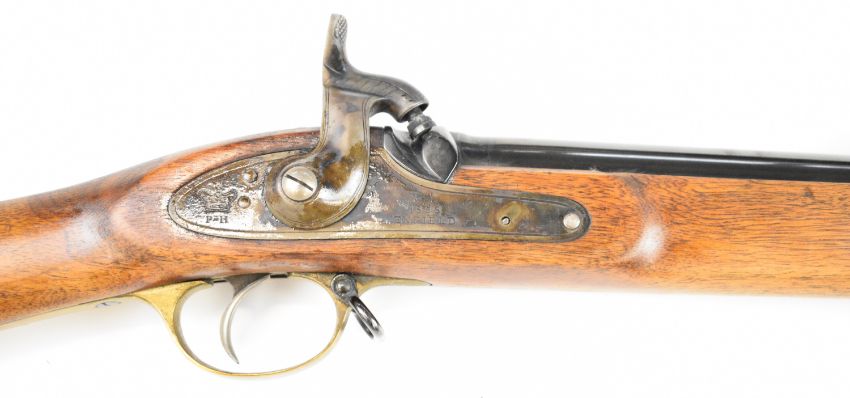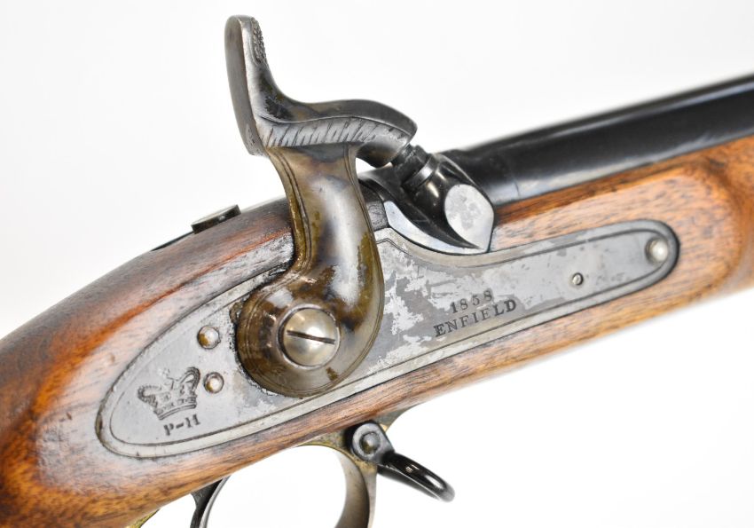 Parker-Hale Enfield pattern 2-band .577 muzzle loading percussion hammer action rifle with 'Enfield 1858' and crown over 'P-H' cypher to the lock, brass trigger guard, butt plate and mounts, steel ram-rod, adjustable ladder sights and 33 inch rifled barrel, overall length 125cm, serial number 4761. PLEASE NOTE THAT A VALID RELEVANT FIREARMS CERTIFICATE IS REQUIRED TO VIEW OR PURCHASE THIS LOT AND FOR ALL SHOTGUNS OR RIFLES PLEASE ENSURE YOU HAVE THE RELEVANT CERTIFICATE BEFORE BIDDING.