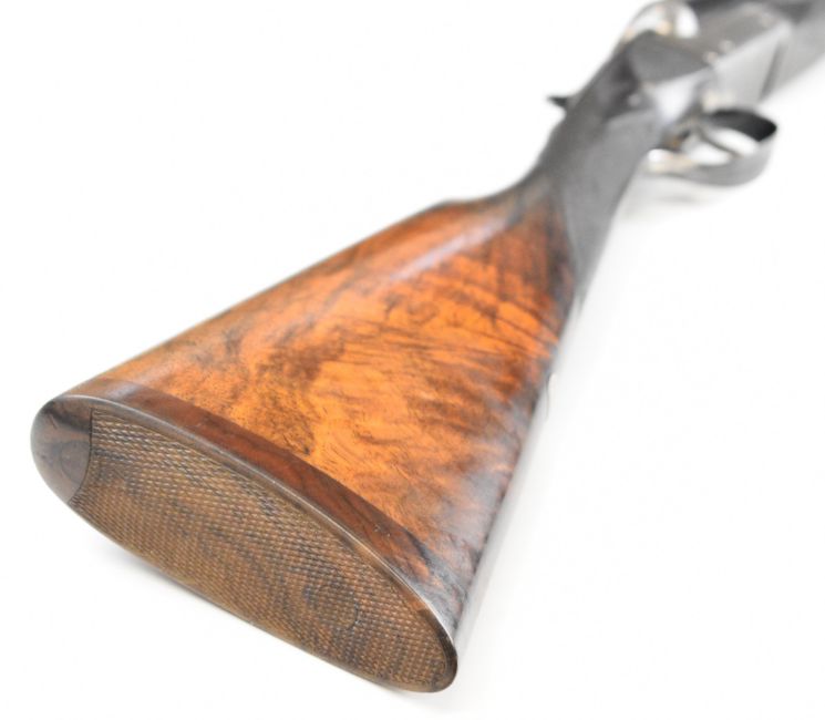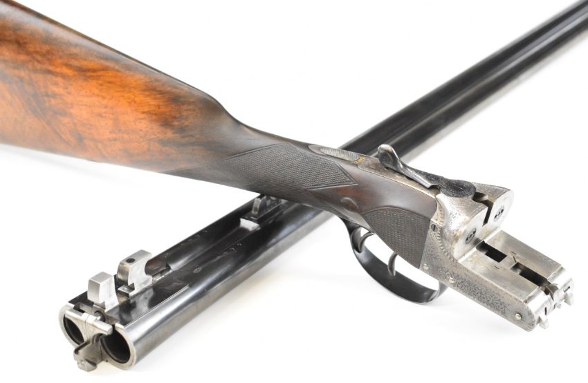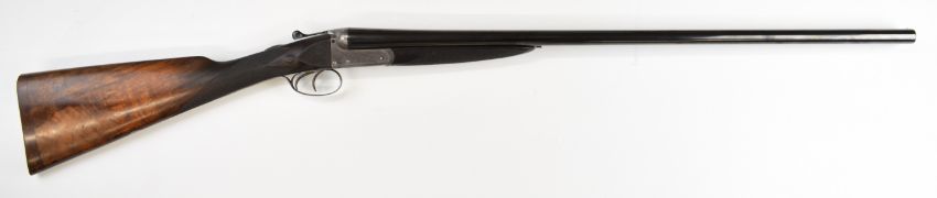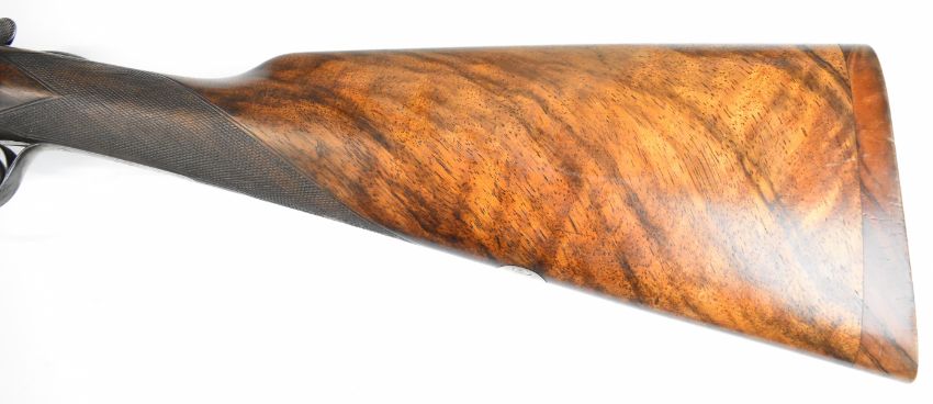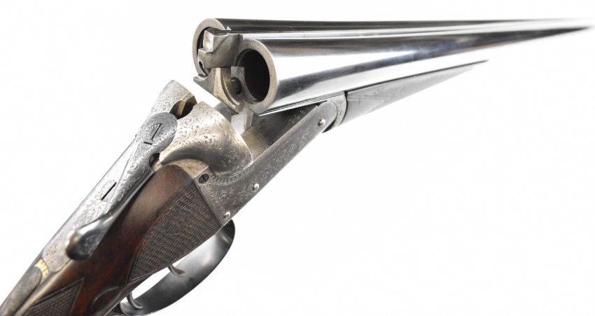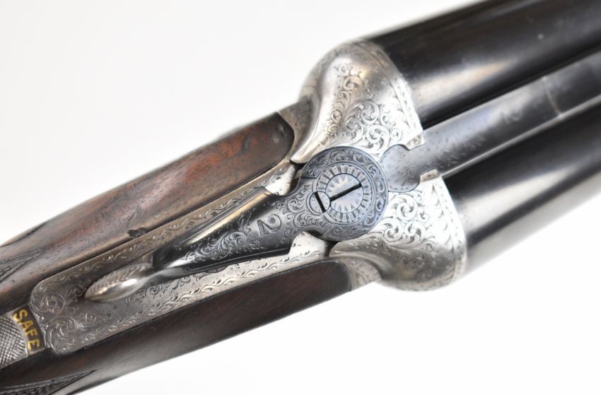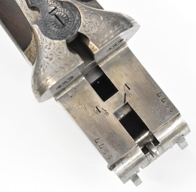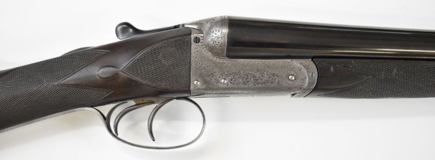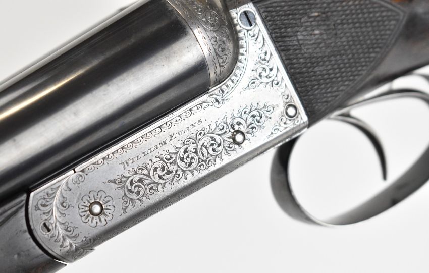 William Evans 12 bore side by side ejector shotgun with named and border engraved locks, border engraved underside, trigger guard, top plate, thumb lever and fences, chequered grip and forend, carved teardrop to the wrist, engraved cartouche to the underside of the stock, double trigger and named 30 inch barrels choked cylinder, overall length 120cm, length of pull 39cm, serial number 9977. PLEASE NOTE THAT A VALID RELEVANT SHOTGUN CERTIFICATE IS REQUIRED TO VIEW OR PURCHASE THIS LOT AND FOR ALL SHOTGUNS OR RIFLES PLEASE ENSURE YOU HAVE THE RELEVANT CERTIFICATE BEFORE BIDDING.