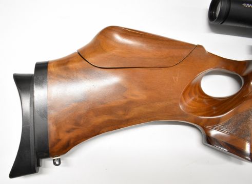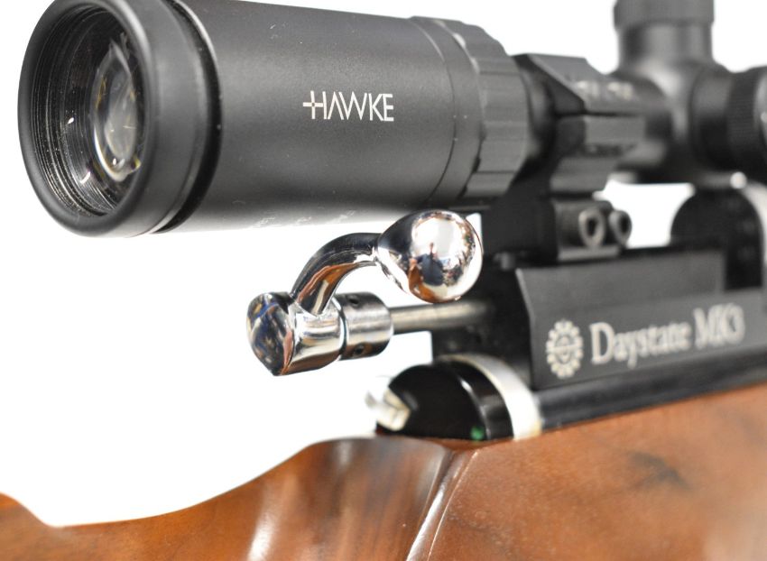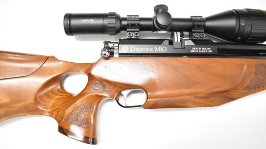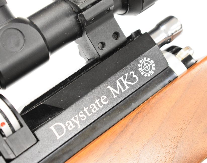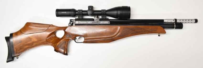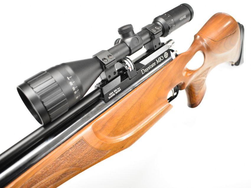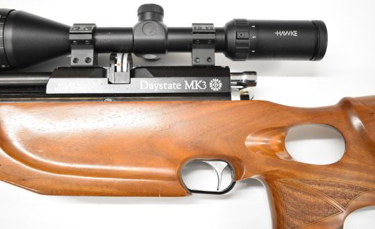 Daystate Mk 3 .177 PCP air rifle with shaped and textured thumb-hole grip, raised cheek-piece, adjustable comb, butt plate and electronic trigger and Hawke Fast Mount 3-9x50 AO scope, serial number 1507, in BSA Guns padded case with instruction manual, charging hose, trigger unit charger and accessories. PLEASE NOTE: ALL POST - 1939 AIR GUNS CAN ONLY BE SHIPPED TO AN RFD AND NOT TO A HOME ADDRESS.