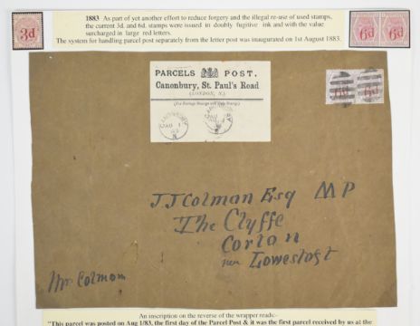 Postal history, first day use of parcel service 1st August 1883, with two 6d on 6d stamps with bar cancellations, Parcels Post label with Canonbury postmarks