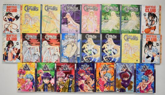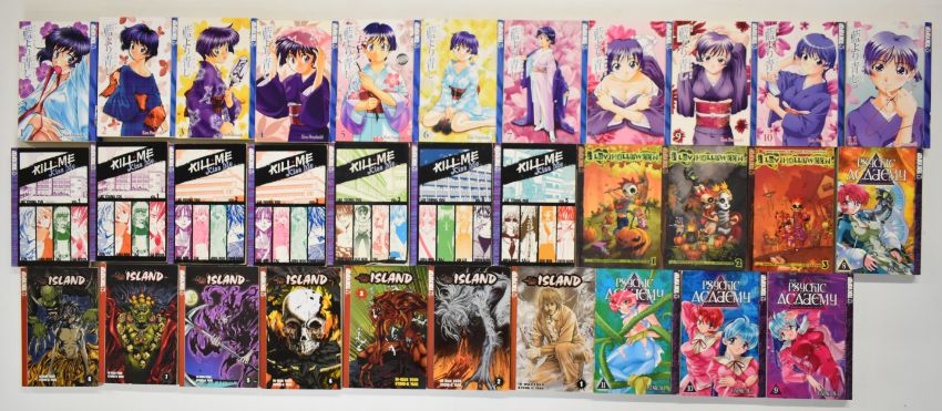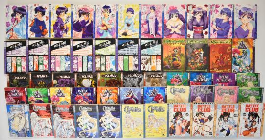 Fifty five TokyoPop Japanese Manga graphic novel comic books comprising Chobits, Battle Club, Island, I Luv Halloween, Psychic Academy, Kiss Me Kill Me and Ai Yori Aoshi, all consecutive runs.
