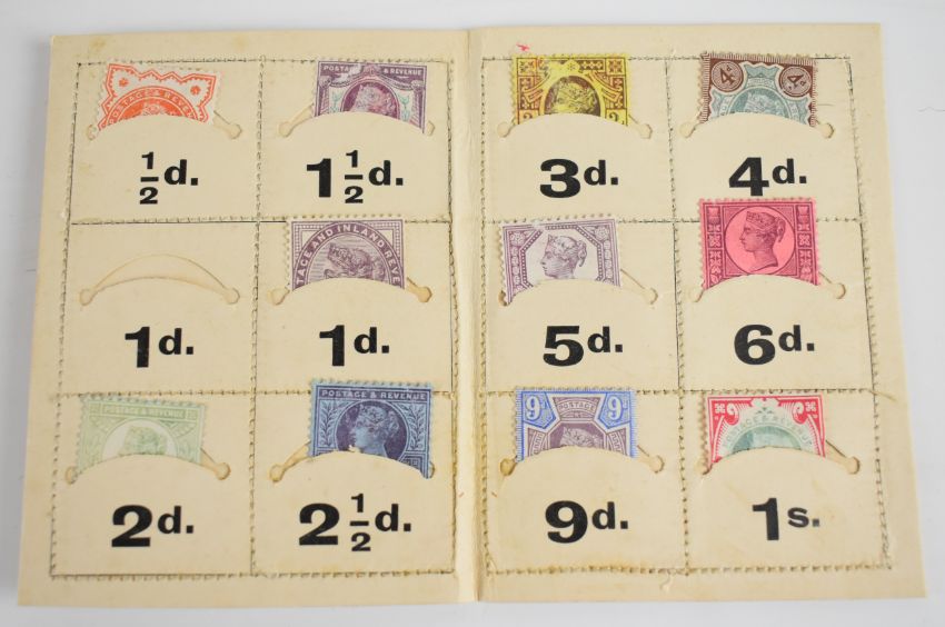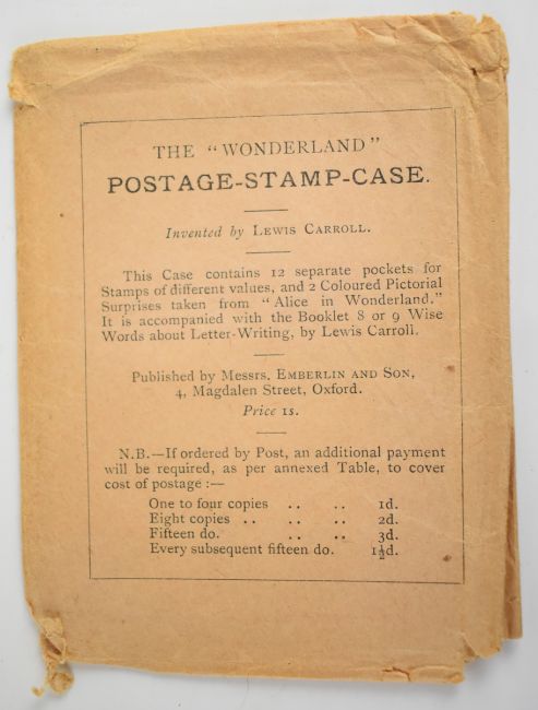 [Rev. Charles Ludwidge Dodgson] Lewis Carroll The Wonderland Postage-Stamp Case comprising printed booklet titled Eight or Nine Wise Words about Letter Writing by Lewis Carroll published Emberlin & Son, with colour illustrated paper slipcase and colour illustrated folding postage stamp holder with pockets for twelve stamps (this copy complete with all but one of the twelve stamps) dated 1889 and with original printed mailing envelope    Provenance Bath Postal Museum