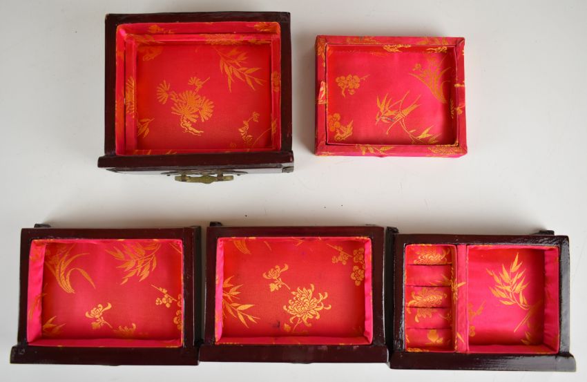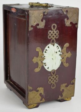 Metal bound Chinese jewellery cabinet with jade or similar carved panels, W15 x D12 x H22cm
