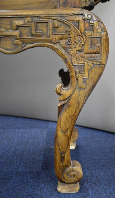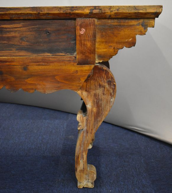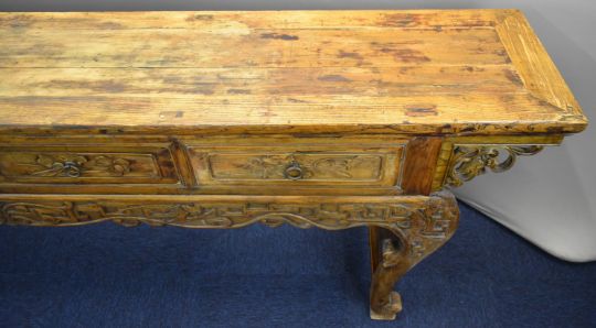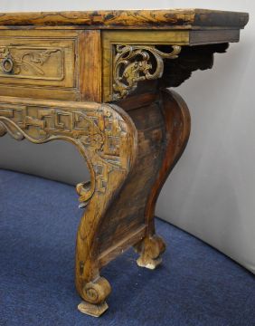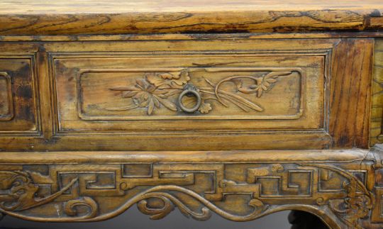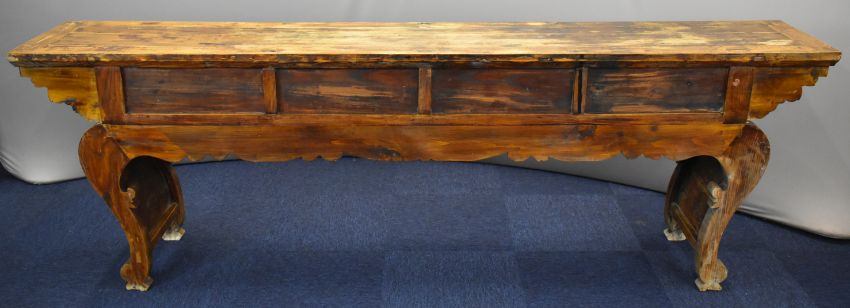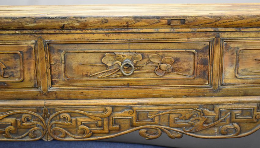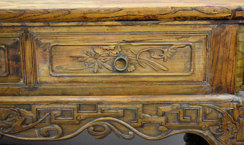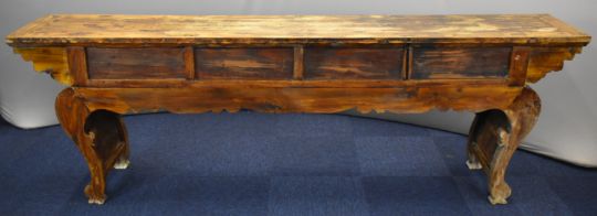 19th/20thC Chinese elm altar or console table with four straight drawers and fretwork mouldings, carved geometric apron, raise don gnurled cabriole legs with platform feet, W264 x D45 x H87cm