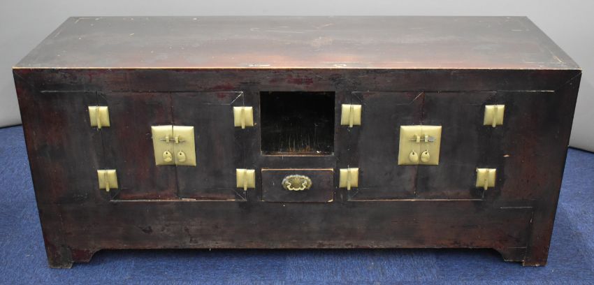 19thC Chinese jointed low sideboard with two twin door cabinets, single drawer and cubbyhole, W163 x D58cm
