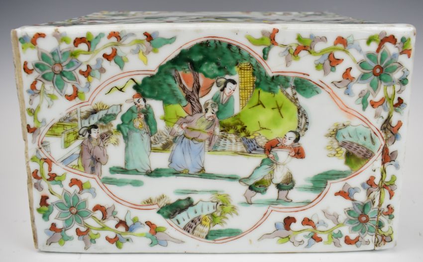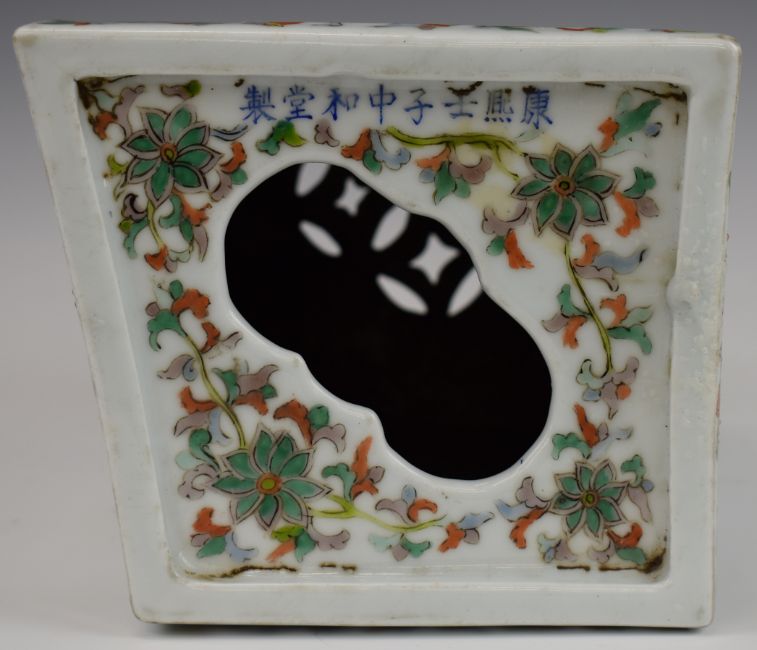 19th/20thC Chinese famille verte pillow or headrest decorated with various court and battle scenes, with pierced sides and calligraphy, W25 x D15 x H19cm