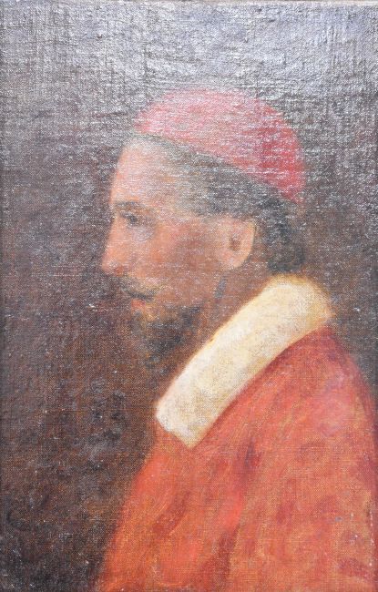 Continental school oil on canvas woman on horseback with woman on foot carrying a basket beside her, 33 x 26cm together with an Old Master or similar school oil on canvas laid on panel, portrait of a Pope or similar male, 29 x 8.5cm, in ornate gilt frame