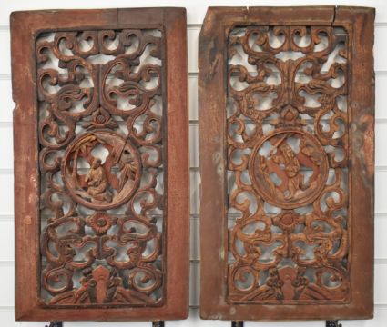 A pair of 18th/19thC carved wood window or door screens / panels with figural cartouches and scrolling surrounds, 67 x 36cm