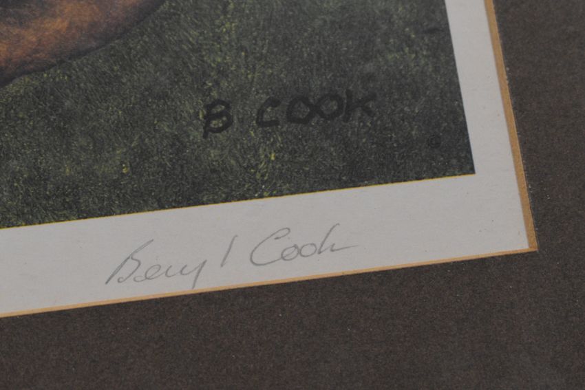 Beryl Cook (1926-2008) Joggers on the Hoe, coloured print signed in pencil bottom right margin and with blind stamp, Alexander Gallery Publications, Bristol (with gallery label on reverse dated August 1985), 46 x 38cm, mounted & framed  Inspired by scenes from Plymouth and in particular 'The Hoe' a city landmark