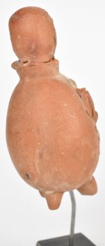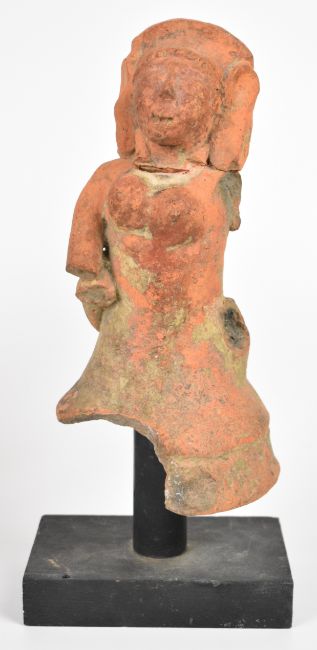 Two pre-Colombian pottery figures on wooden/metal stands, tallest 30cm