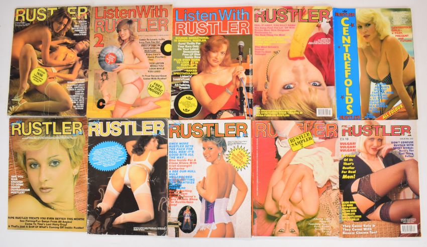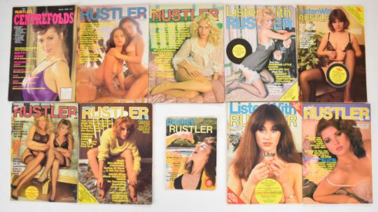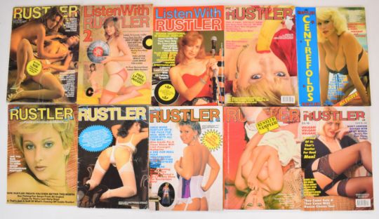 [Adult Entertainment] Rustler, a large collection of vintage and later glamour and erotic magazines from 1970s-1990s including Rustler issue no.1 from 1976, also includes issues of Listen With Rustler, Naughty Bits, Centerfolds and Pocket Rustler (approximately 170 issues)