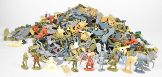 A quantity of Airfix and similar plastic model toy soldiers to include World War II, Cowboys & Indians, Medieval Knights and Napoleonic examples.
