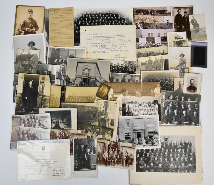 Collection of photographs, postcards and newspaper clippings relating to postal worker including real photographic postcard of Calne postal worker, real photographic postcard of postal workers and soldiers by GPO van at West Down, Devon, various letters from Government and Post Office Department, photographs of GPO vehicles and motorcyclists, assorted handbills and leaflets and various photographs of postmen and groups