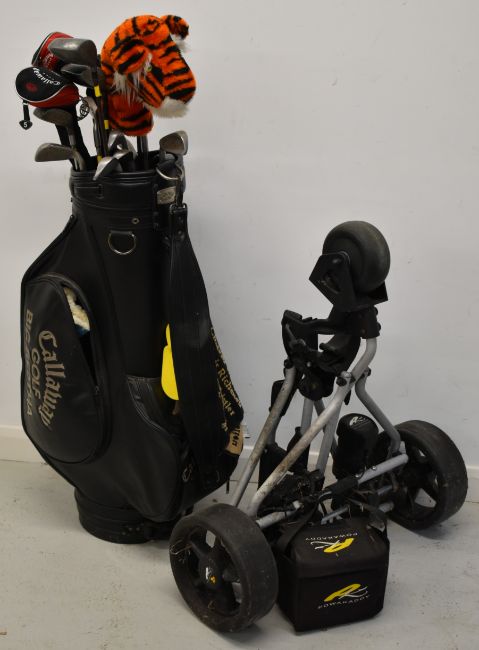 A set of left handed golf clubs including Calloway Big Bertha ERC II driver, Calloway woods, Regal irons and Wilson putter, in Calloway Big Bertha bag with Powakaddy electric trolley.