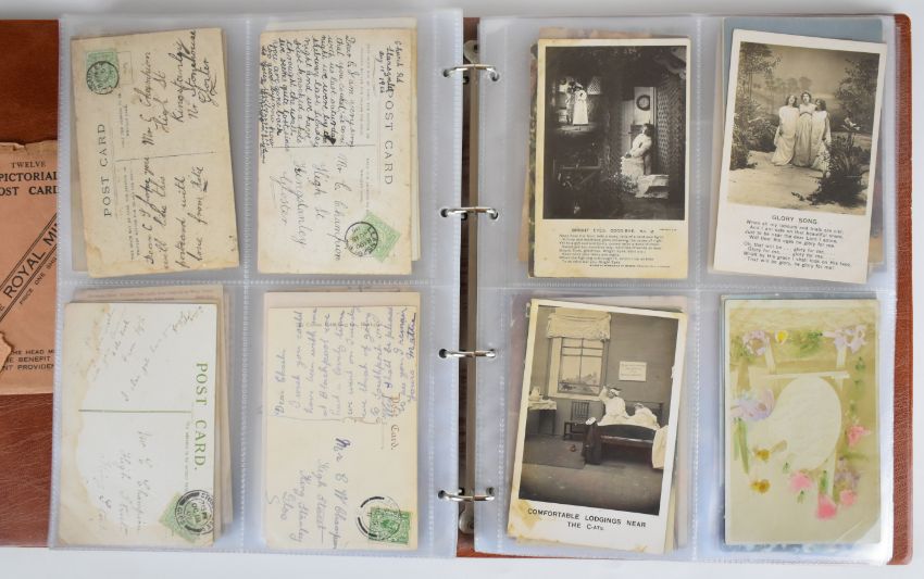 Collection of around two hundred and fifty postcards, mostly Edwardian through WW1, including around fifty cards in the Bamforth 'Hymn' and 'Songs' series (mostly unused), Christmas and greetings cards, seaside humour and comic including Donald McGill, Will Owen, Tom Browne and Mabel Lucie Attwell, photographic images including The Toreador Pierrots, animals, Court of Arts Japan-British Exhibition, funeral of King Edward VII, several views from Stroud, Minchinhampton, Painswick, Churchdown, Weston, Stratford-On-Avon, a series of images from inside The Royal Mint London and set of six humorous pictorial cards from The English Lakeland (in envelope), with later images of autographed actors from the Heartbeat series, photos of Adam Faith and Tommy Steele, postcard and piece of Berlin Wall and colour portrait cards of famous stars including Joan Fontaine, Gregory Peck, Jim Dale, Debbie Reynolds, Joan Collins and others, various cuttings etc, housed in two modern albums (2)