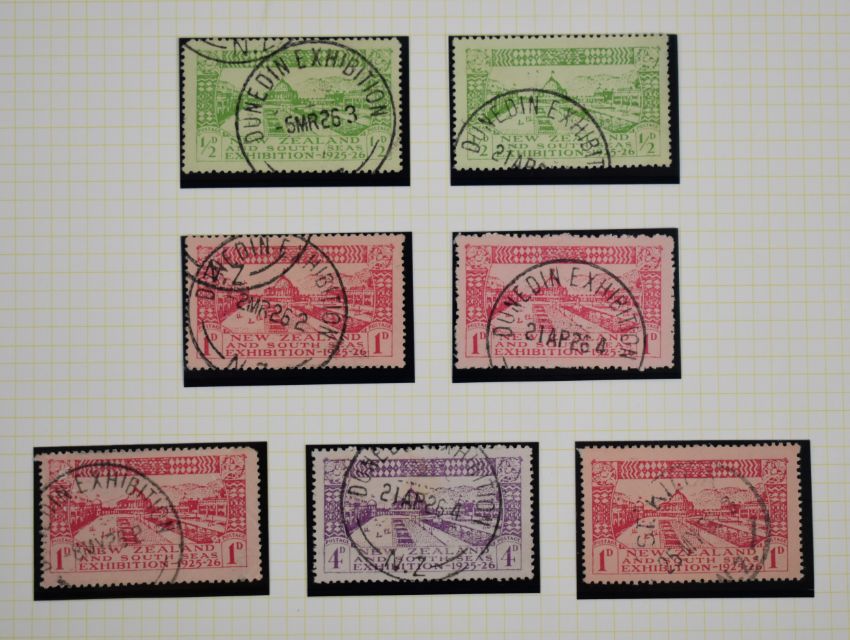 New Zealand stamps comprising a small study of 1925/26 Dunedin exhibition stamps including 4d 'F' in postage flaw, selection of exhibition and other postmarks
