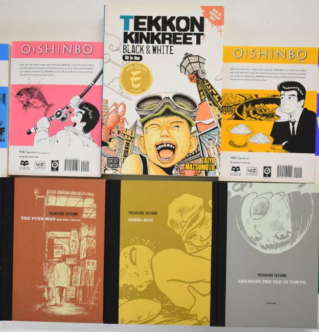 Fourteen Japanese Manga graphic novel comic books comprising titles Oishinbo, Barefoot Gen, Black & White, The Push Man, Good-Bye and Abandon the Old in Tokyo.