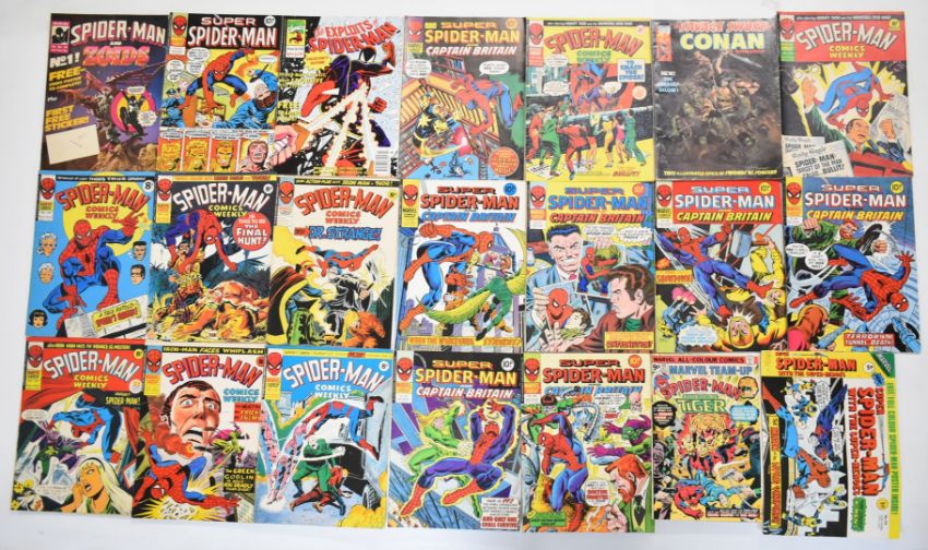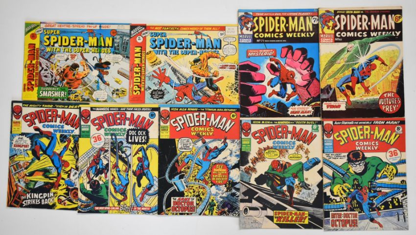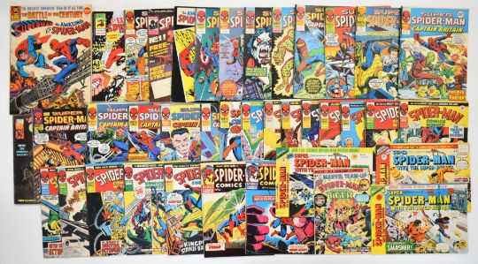 Thirty seven Spider-Man weekly and similar comics together with a DC / Marvel treasury size Superman vs Spider-Man issue.