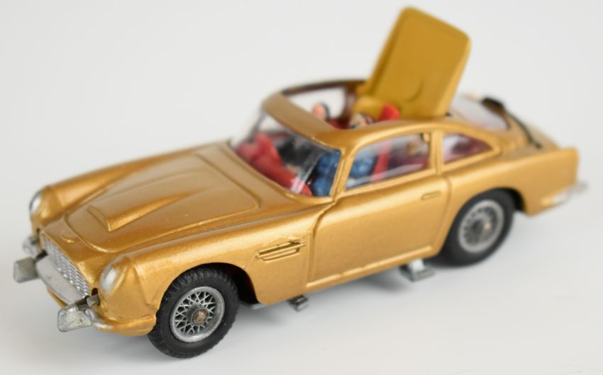Corgi Toys diecast model James Bond 007 Aston Martin DB5 with gold body, red interior, opening roof / ejector seat, bandit passenger, retractable machine guns and bullet screen, 261, in original box.
