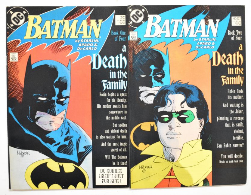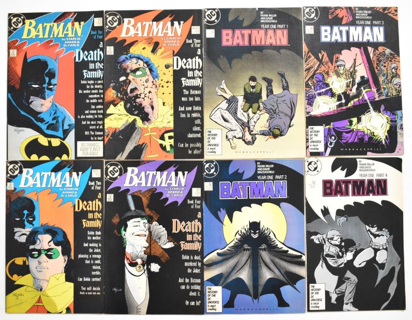 Eight Batman comics by DC comprising issues #404-407 'Year One' and #426-429 'Death in the Family' storylines.