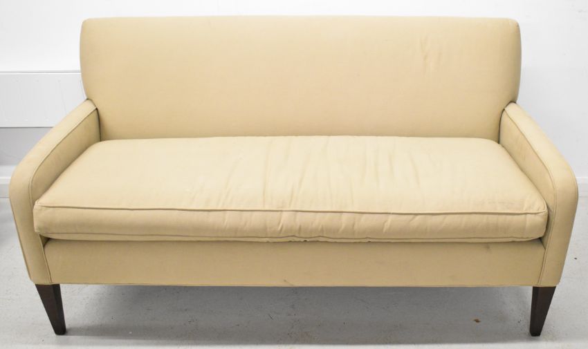 Workbench two seat sofa, raised on square tapering legs, length 163cm