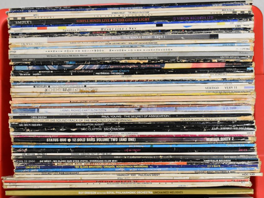 Sixty Rock and Pop LPs including Kate Bush, Queen, Police, Spandau Ballet, Big Country, Simple Minds, Tears for Fears, Duran Duran, Ultravox, A-Ha, Adam and the Ants, The Who, ELO, Dire Straits, The Pretenders, Elton John, 10cc, Bon Jovi, Fleetwood Mac, Daryl Hall, Jackie Wilson, Whitney Houston, George Benson, Paul Young, Eric Clapton, Rod Stewart, Status Quo, Go West, Sad Café, Debbie Gibson, ABC, Europe etc. Vinyl appears VG+ or better in the main, some may grade down. Some of the covers have edge wear from storage.